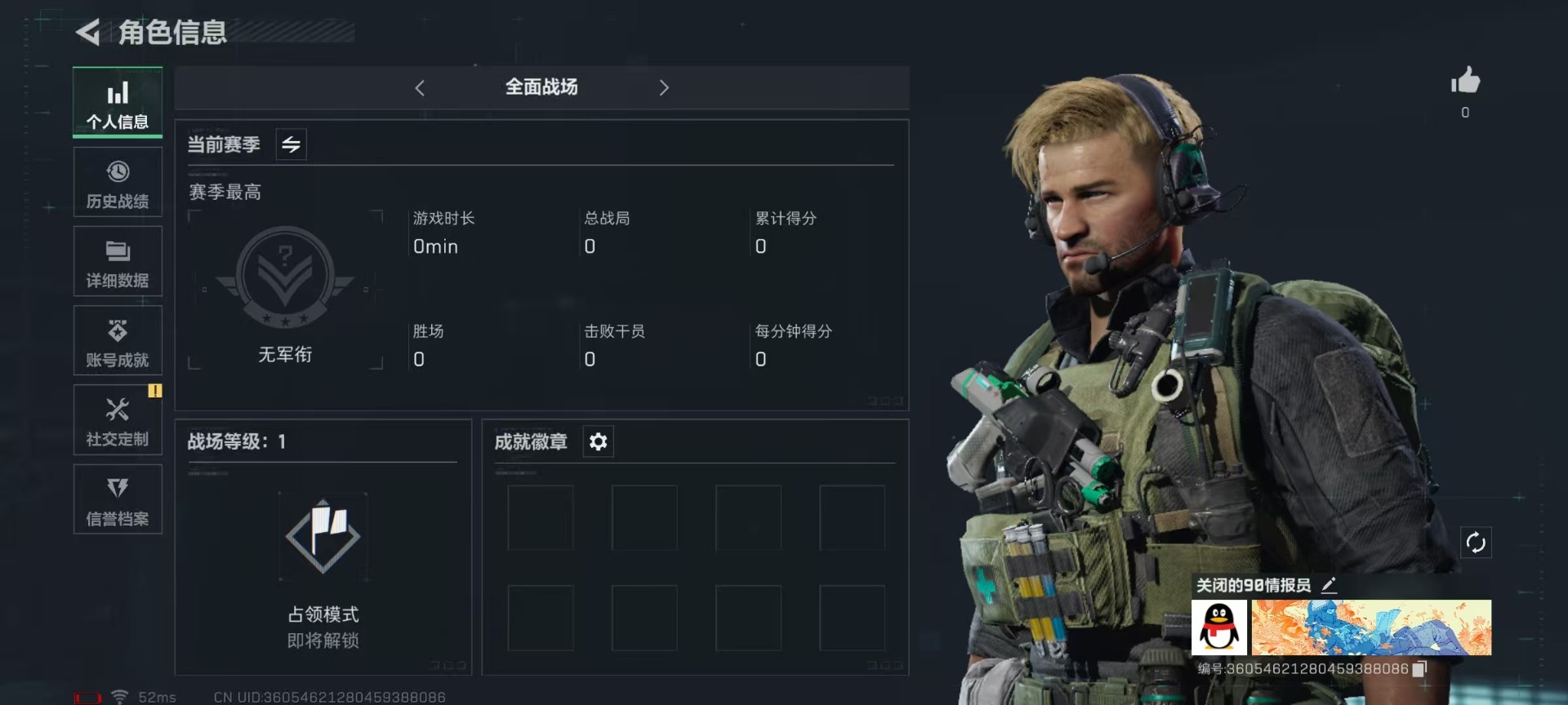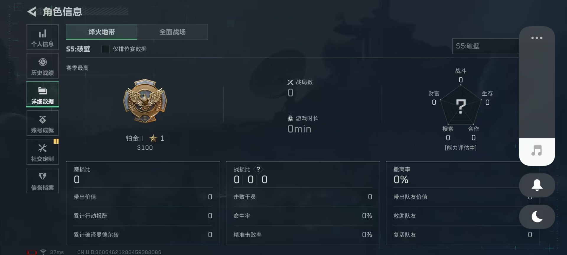 [11523436]总资产:111M 哈夫币:94.982K 可二次 可修改实名 烽火地带段位:铂金 全面战场段位:无段位