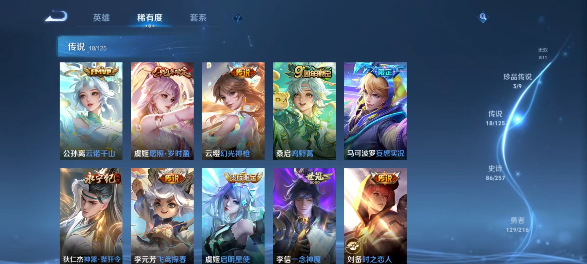 - PX_2097126-18 安卓QQ/至尊星耀/82皮肤/113英雄/0典藏/0珍品无双/0无双/0珍品传说/6传说/22史诗/6稀有英雄 【6 传说皮肤】星穹之声 王昭君,仲夏夜之梦 貂蝉,山海·炽霜斩 李信,炽翼辉光 伽罗,愿照·众生和 妲己,幻光神枪 云缨, 【22 史诗皮肤】五谷丰年 鬼谷子,鬼剑武藏 宫本武藏,魅力维加斯 妲己,女仆咖啡 妲己,星界游侠 暃,舞动绿茵 蔡文姬,鹰眼统帅 狄