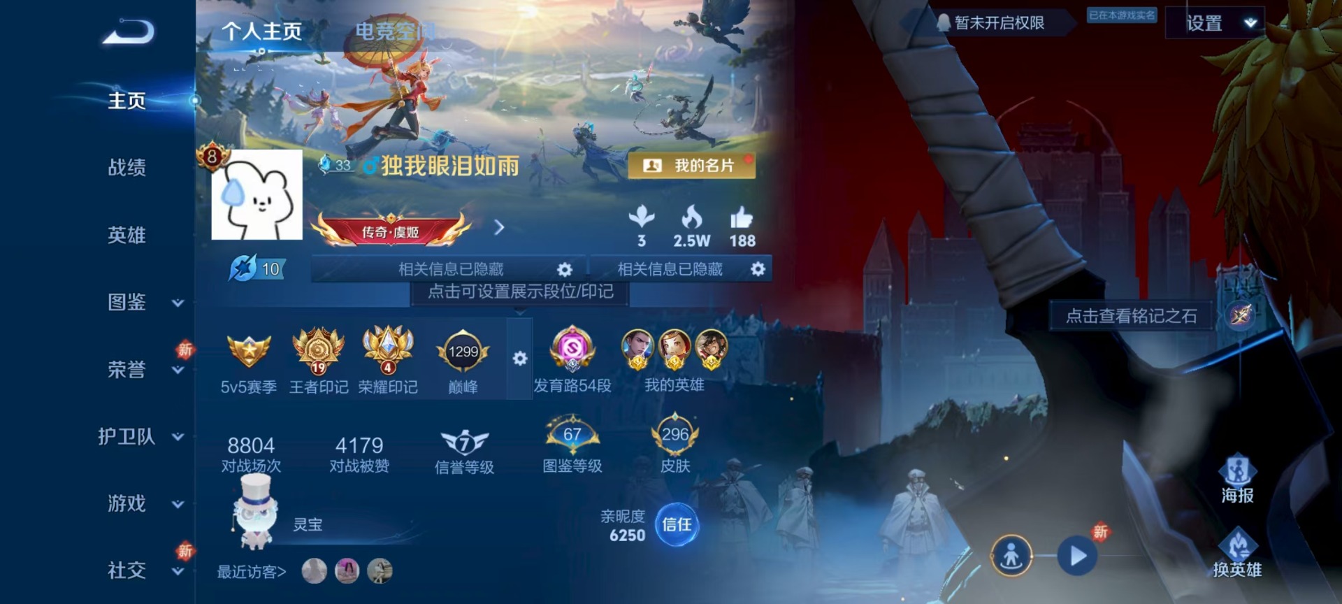 - [12265667]实名: 可修改 贵族等级: V6 英雄数: 124 皮肤数: 166 传说皮: 炽阳神光,挚爱之约,山海·炽霜斩 限定皮: 遇见飞天,李小龙,游园惊梦,高山流水,五谷丰年,齐天大圣