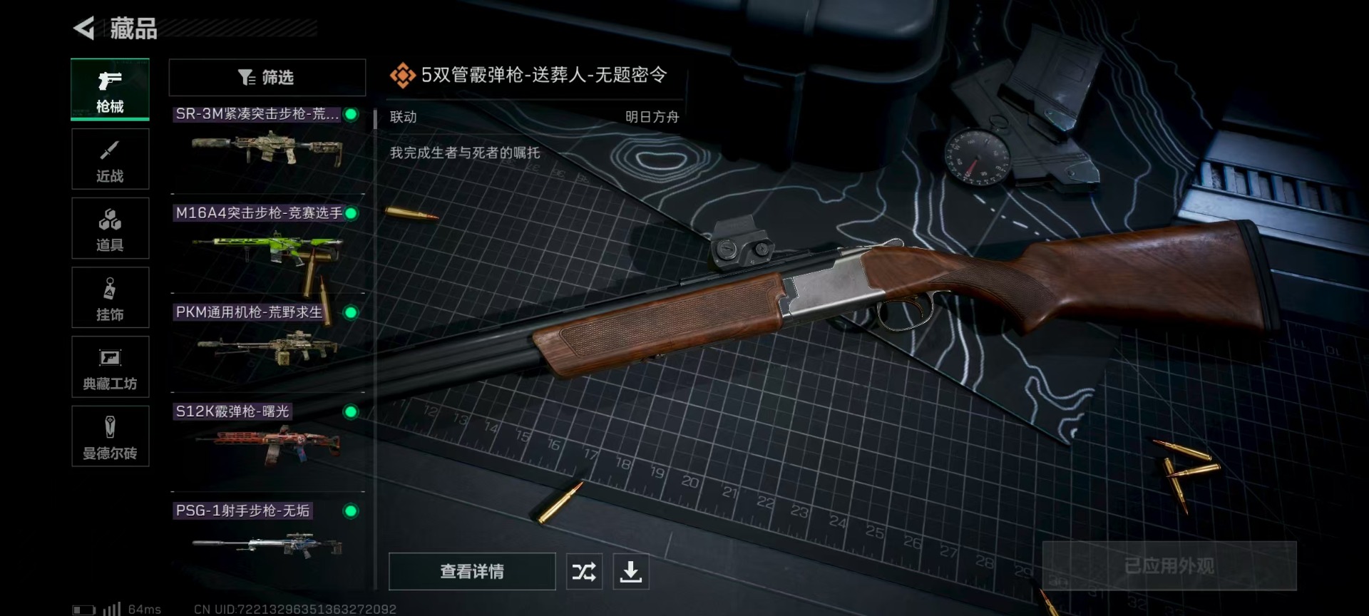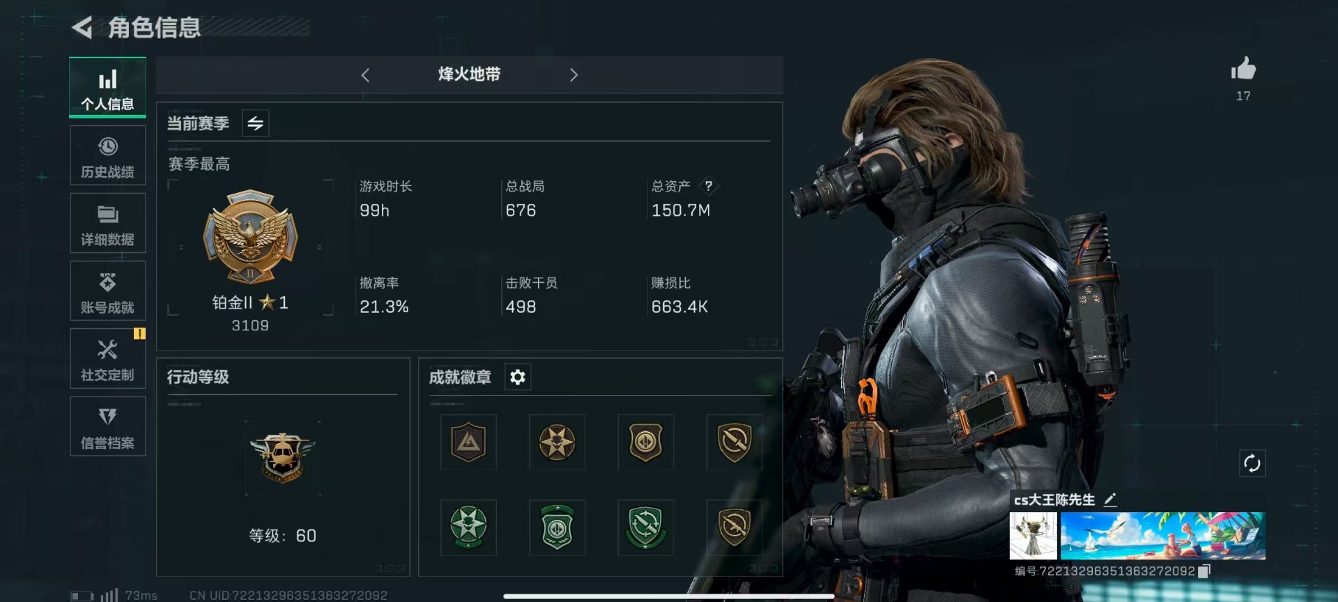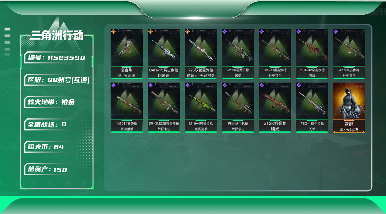 [11523590]可二次 可修改实名 实名:可修改 高级安全箱(9.17到期) 烽火地带段位:铂金 全面战场段位:无段位 总资产:150.7 哈夫币:64.601 传说武器皮肤:复合弓-黑-天际线,CAR-15突击步枪-阿米娅,725双管霰弹枪-送葬人-无题密令 史诗武器皮肤:PKM通用机枪-荒野求生,SR-3M紧凑突击步枪-荒野求生,AKM突击步枪-林中猎手,M16A4突击步枪-竞赛选手,M1014霰弹枪-林中猎手,SV-98狙击步枪-林中猎手,PTR-32突击步枪-英雄,PSG-1射手步枪-无垢,M250通用机枪-囚徒,S12K霰弹枪-曙光 干员外观:露娜-黑·天际线