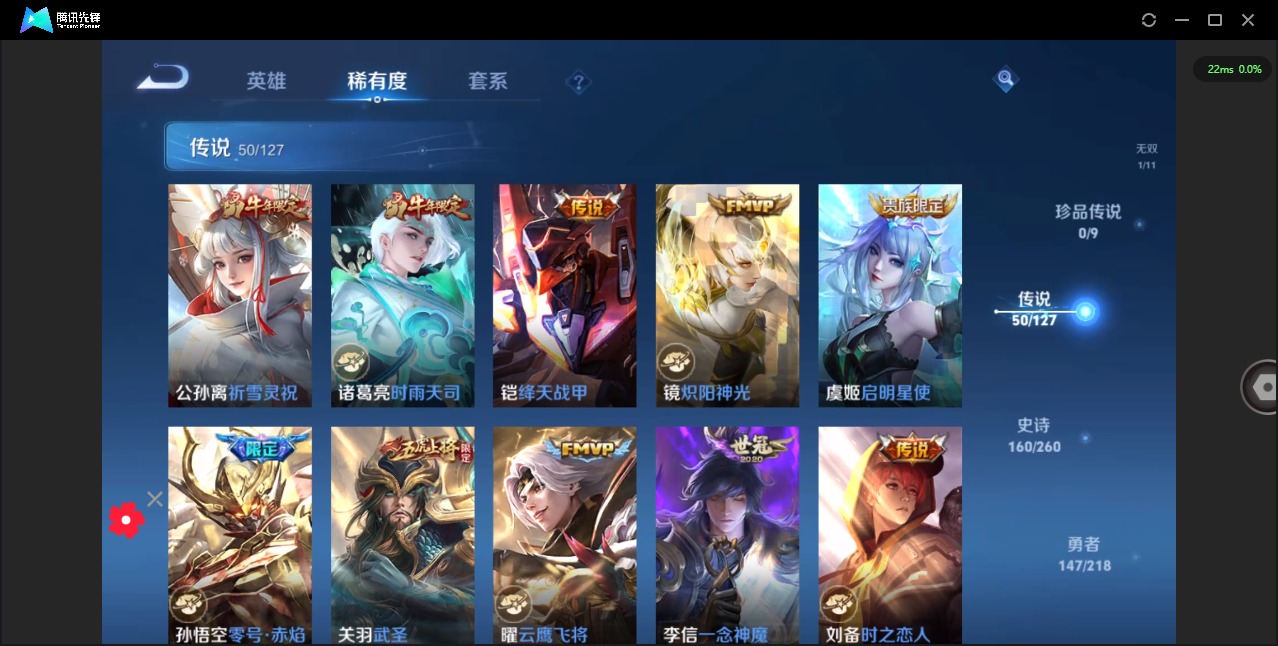 - [11714400]V6 1无双 1珍品传说 5传说 121英雄 136皮肤 可修改实名 貂蝉小国标 优质装备:离恨烟(公孙离无双),器灵·落星盏,炽阳神光,仲夏夜之梦(大飞蛾) 传说皮:幻光神枪 限定皮:愿照·九州拓(澜年限),陌上桑,鸣野蒿,至尊宝,玉兔公主 史诗皮:器灵·浮梦炉,化蝶舞,星界战将,龙之律动,怒海争锋,炽弈燎原,破空之剑,蒙犽顽岩魄,芈月浮光幕影,蔬乡物语(鲁班七号),百相守梦-百里守约,百相守梦-黄忠,遇见神鹿,紫霞仙子,黄金分割率,特工魅影,猫狗日记-孙策,节奏热浪,水果甜心,星夜王子,功夫厨神,暗隐猎兽者,鬼剑武藏,舞动绿茵,缤纷独角兽,乘风破浪,水晶猎龙者,曙光守护者,原初追逐者,圣诞狂欢,圣诞恋歌,鹰眼统帅,魅力维加斯