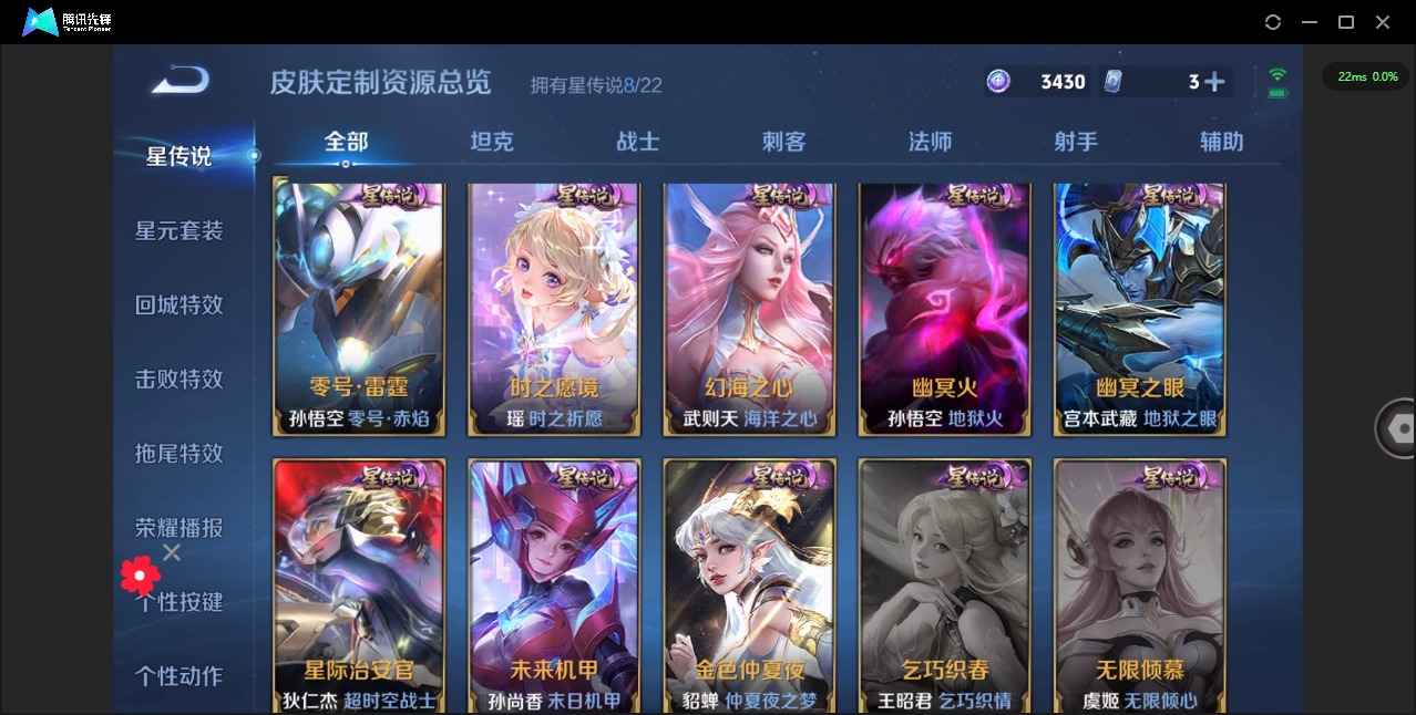 大乔白鹤梁神女,黄忠烈魂,哪吒逐梦之翼,甄姬幽恒,甄姬女儿国国王,铠青龙志,曹操天狼征服者,伽罗天狼溯光者,伽罗太华,苏烈玄武志,张飞虎魄,赵云龙胆,孙膑天狼运算者,干将莫邪冰霜恋舞曲,典韦岱宗,孙尚香异界灵契,不知火舞绯月行,牛魔奔雷神使,鲁班七号乒乒小将,项羽霸王别姬,吕布御风骁将,后羿如梦令,后羿辉光之辰,露娜一生所爱,庄周玄嵩,镜匿光追影者,庄周云端筑梦师,诸葛亮时雨天司,兰陵王默契交锋,公孙离祈雪灵祝,公孙离玉兔公主,公孙离蜜橘之夏,裴擒虎梅西,貂蝉逐梦之音,裴擒虎李小龙,裴擒虎天狼狩猎者,东皇太一逐梦之光,上官婉儿梁祝,上官婉儿天狼绘梦者,花木兰默契交锋,花木兰瑞麟志,花木兰青春决赛季,安琪拉魔法小厨娘,马可波罗逐梦之星,猪八戒猪悟能,女娲补天,孙悟空孙行者,孙悟空大圣娶亲,芈月白晶晶,孙悟空至尊宝,孙悟空美猴王,百里玄策白虎志,马超神威,雅典娜神奇女侠,赵云引擎之心,云中君时之祈愿,妲己时之彼端,韩信傲雪梅枪,韩信飞衡,韩信逐梦之影,百里守约朱雀志,蔡文姬奇迹圣诞,瑶时之祈愿,虞姬霸王别姬,妲己热情桑巴,嫦娥如梦令,王昭君凤凰于飞,王昭君星穹之声,关羽武圣,关羽冰锋战神