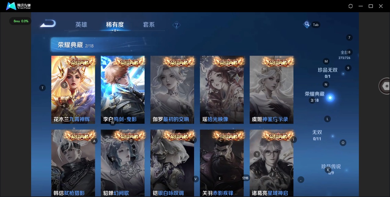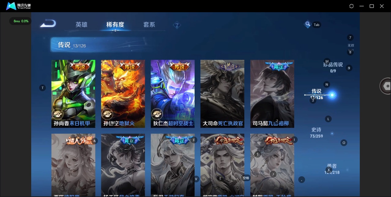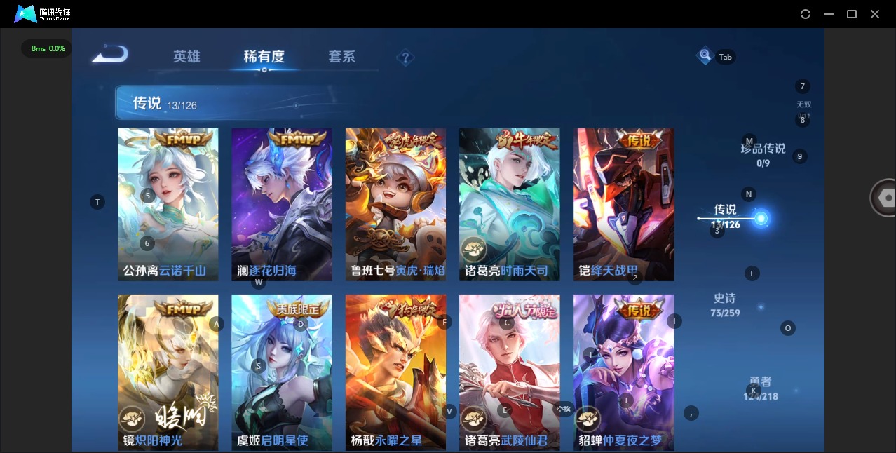 - [11523321]V8 1典藏 4珍品传说 18传说 123英雄 211皮肤 可修改实名 女号 优质装备:九霄神辉(木兰典藏),怪盗基德,酷洛米之心,大耳狗之梦,黄金射手座,冠军飞将,炽阳神光,仲夏夜之梦(大飞蛾),游龙清影(小青龙),无双飞将,妄想实况,霜月吟 珍品传说:时之奇旅-孙策 传说皮:续相思,幻光神枪 珍宝阁皮:蔷薇恋人 限定皮:愿照·九州拓(澜年限),愿照·福禄聚(蔡文姬年限),愿照·岁时盈(虞姬年限),愿照·山河定(司空震年限),愿照·众生和(妲己年限),愿照·千秋盛(女娲年限),鸣野蒿,高山流水 史诗皮:鸭鸭历险记-刘禅,绮世丹青,化蝶舞,龙之律动,百相守梦-周瑜,茶境仙,破空之剑,蒙犽顽岩魄,怒海争锋,蔬乡物语(鲁班七号),琥珀纪元伽罗,百相守梦-百里守约,百相守梦-黄忠,遇见神鹿,紫霞仙子,永昼,江河有灵,雪夜绮愿(周瑜),偶像歌手,无限星赏官,末日机甲-吕布,猫狗日记-孙策,时之恋人-孙尚香,节奏热浪,摇滚巨星,水果甜心,天才门将,心灵骇客,暗隐猎兽者,幽灵船长,鬼剑武藏,舞动绿茵,缤纷独角兽,乘风破浪,逐浪之夏,水晶猎龙者,箭羽风息,金属风暴,圣诞狂欢,圣诞恋歌,鹰眼统帅,魅力维加斯,未来纪元-赵云