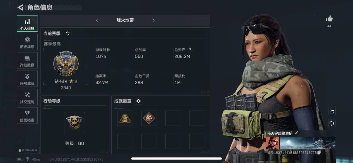 [11523714]总资产:206.3M 1干员外观 5传说枪械 哈夫币:42.527K 顶级安全箱(3×3)9.15号到期 可二次 可修改实名 优质装备:顶级安全箱(3x3) 烽火地带段位:钻石 全面战场段位:列兵 传说武器皮肤:CAR-15突击步枪-阿米娅,复合弓-黑-天际线,勇士冲锋枪-能天使-午夜邮差,725双管霰弹枪-送葬人-无题密令,M4A1突击步枪-蚀金玫瑰 干员外观:红狼-蚀金玫瑰