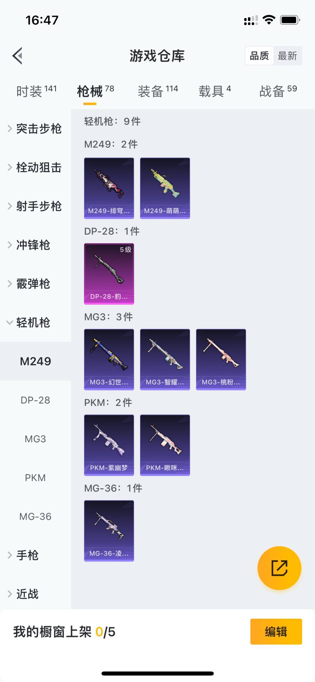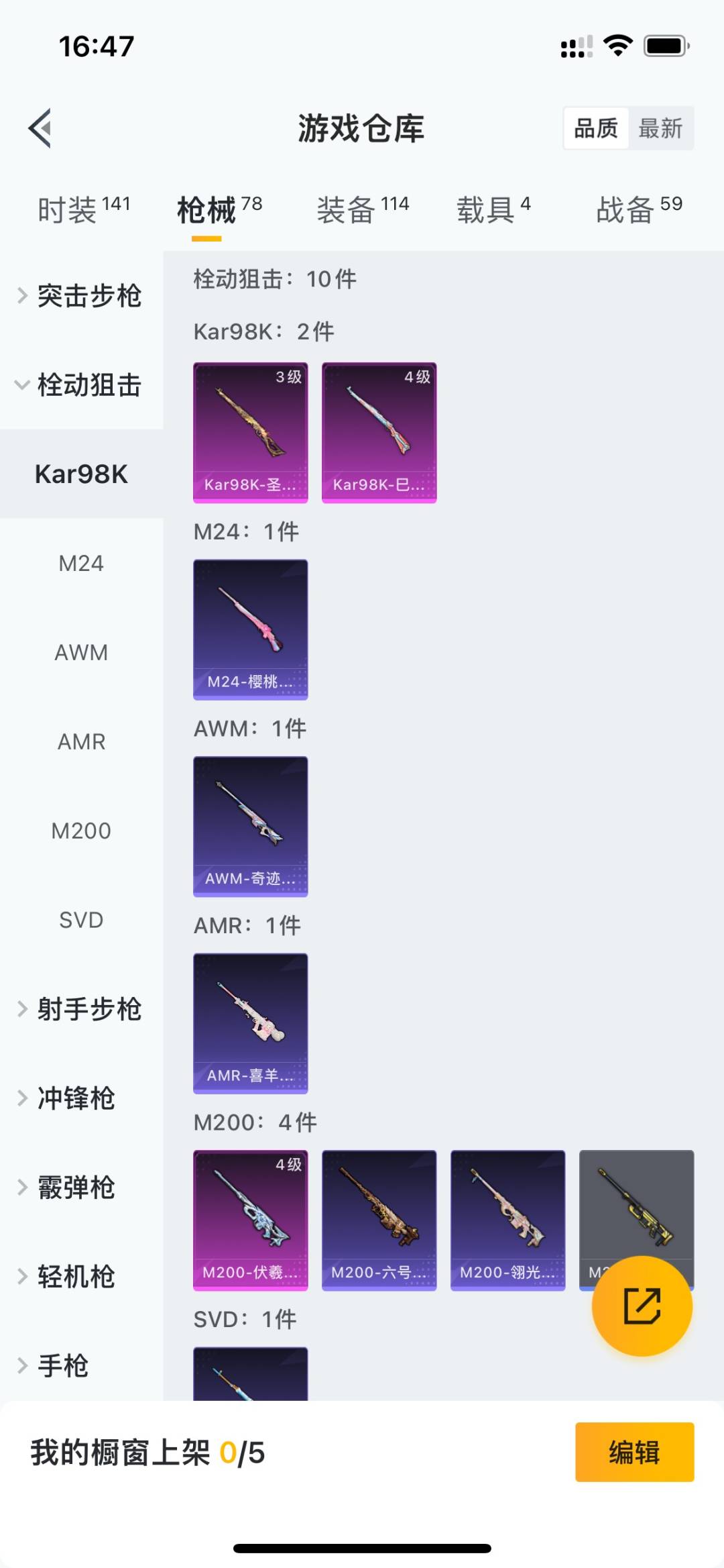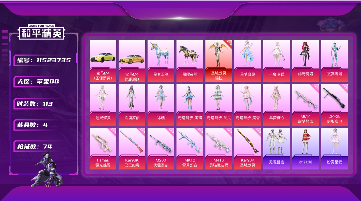 [11523735]1红装 11粉装 8特效枪 4载具 4印记 可二次 可修改实名 优质装备:圣域龙灵-瑞拉,二级圣域龙灵-瑞拉(2级瑞拉),星梦玉骢,宝马M4(圣保罗黄),宝马M4(灿阳金),一级宝马M4(灿阳金),黑曜夜骑,千金淑猫,玄冥寒域,M200-伏羲圣卦,翎光蝶翼,Famas-翎光蝶翼,MK12-雪月幻音,Kar98K-圣域龙灵,MK14-甜梦熊击,冷漠罗丽,M416-灵猫魔法师,绯穹魔姬,奇迹舞步-贝贝,奇迹舞步-美雪,奇迹舞步-美琪,羊梦糖心,冰魄,Kar98K-巳巳如意 热门装扮:星梦奇缘 稀有枪皮:DP-28-豹影疾电 五级特效枪:五级DP-28-豹影疾电,五级MK14-甜梦熊击 四级特效枪:四级Kar98K-巳巳如意,四级M200-伏羲圣卦,四级Famas-翎光蝶翼,四级MK12-雪月幻音 三级特效枪:三级M416-灵猫魔法师,三级Kar98K-圣域龙灵 紫色装扮:SS31特训套装,云朵鹅,彩虹兔,雪绒豹,SS33特训套装,时希公主,绛羽幽主,蜜露汐语,黯羽织刑,粉雾星云,都市丽猫,无暇誓言,蓝冰羽,紫幽梦,SS32特训服(SS32特训套装),猎影月神,冰晶湖光,琉璃花蕾,恋语绒绒,雪夜云雾 优质战备:奇迹舞步降落伞,喜羊羊与灰太狼降落伞,绯穹魔姬降落伞,灵猫魔法师飞行器,灵猫魔法师降落伞,赛博古神降落伞,智耀战神降落伞,圣辉之星降落伞,圣域龙灵降落伞,圣域金龙飞行器,雪月幻音降落伞,星月云朵降落伞,戏水时光飞行器,翎光蝶翼降落伞,第五大道降落伞,洛神天依降落伞 二级优质战备:二级圣域金龙飞行器