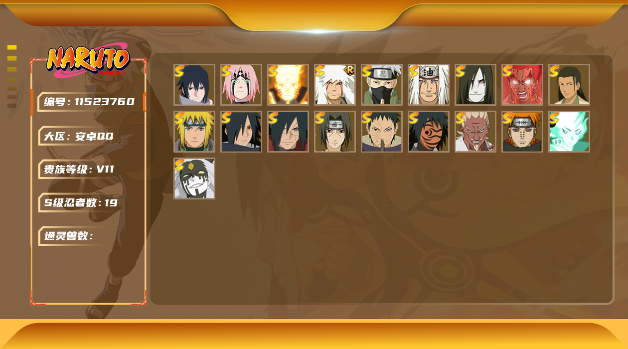 [11523760]V11 19S忍 34A忍 861.4W战力 可二次 可修改实名 S级忍者:艾「忍界大战」,大筒木桃式,宇智波斑「秽土转生·解」,千手柱间·木叶创立,宇智波佐助「永恒万花筒」,神秘面具男 「红夜之刃」,春野樱 「忍界大战」,漩涡鸣人 「九喇嘛连结」,迈特凯「死门」,宇智波斑 「木叶创立」,宇智波带土 「忍界大战」,自来也 「舞之豪杰」,旗木卡卡西「须佐能乎」,大筒木舍人 「最终章」,宇智波鼬 「须佐能乎」,佩恩「天道」,波风水门,大蛇丸,自来也