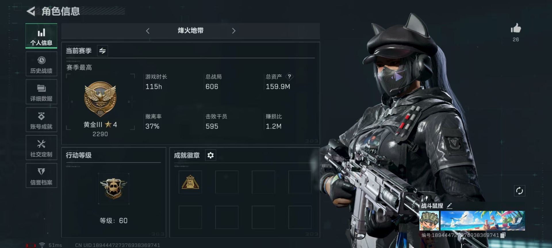 [11523781]总资产:159.9 1干员外观 4传说枪械 顶级安全箱(9.17到期) 可二次 可修改实名 烽火地带段位:黄金 全面战场段位:无段位 哈夫币:200.335 传说武器皮肤:AK-12突击步枪-夜鹰,复合弓-黑-天际线,CAR-15突击步枪-阿米娅,725双管霰弹枪-送葬人-无题密令 史诗武器皮肤:SR-25射手步枪-尖端治疗,PKM通用机枪-荒野求生,AS Val突击步枪-尖端治疗,M700狙击步枪-守夜人,SG552突击步枪-尖端治疗,Ash-12战斗步枪-守夜人,MP5冲锋枪-深海恐惧,SR-3M紧凑突击步枪-荒野求生,勇士冲锋枪-深海恐惧,SG552突击步枪-深海恐惧,AKM突击步枪-林中猎手,.357左轮-幸运时刻,PKM通用机枪-守夜人,SVD狙击步枪-荒野求生,M1014霰弹枪-林中猎手,SV-98狙击步枪-林中猎手,AS Val突击步枪-典狱官,M250通用机枪-囚徒,腾龙突击步枪-无垢,MP7冲锋枪-无垢,QBZ95-1突击步枪-曙光,SVD狙击步枪-阿萨拉工艺,M14射手步枪-黑鹰坠落 干员外观:露娜-黑·天际线