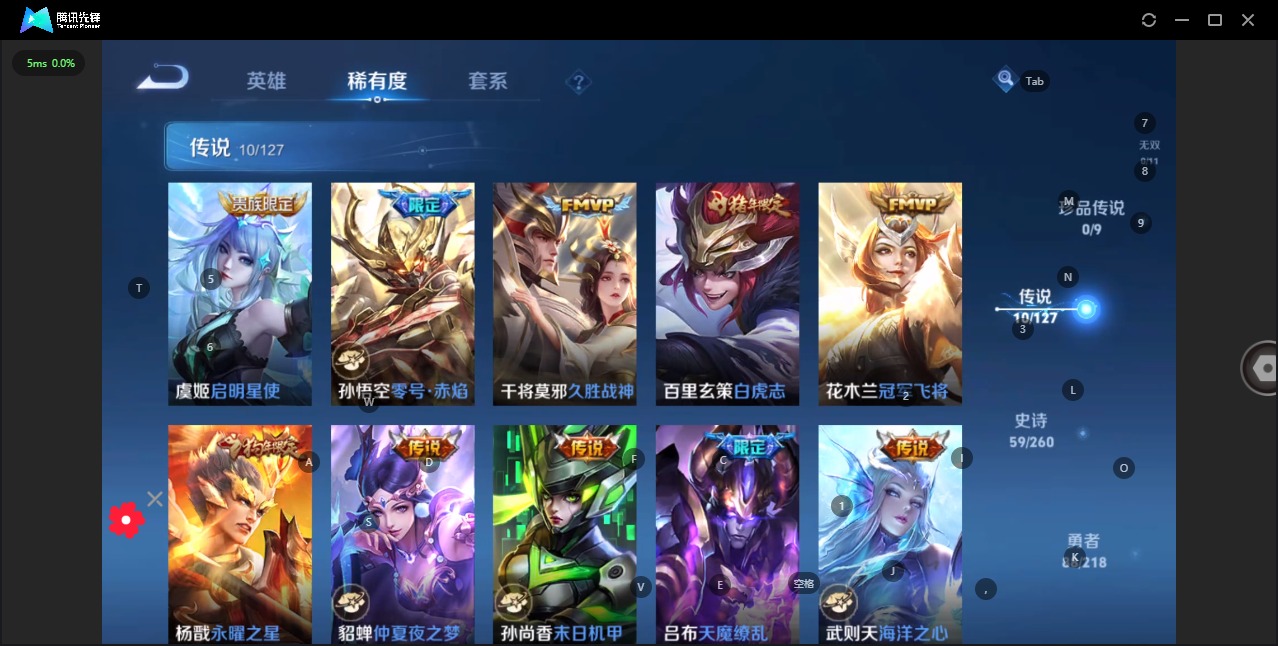 - [11877542]V9 1典藏 27传说 124英雄 338皮肤 典藏英雄武则天 可修改实名 优质装备:星域神启(倪克斯贼亮),黄金狮子座,冠军飞将,云鹰飞将(小将军),黄金白羊座,猫影幻舞,炽阳神光,一念神魔,末日机甲-孙尚香(绿蚂蚱),地狱火,仲夏夜之梦(大飞蛾),零号·赤焰,海洋之心,地狱之眼,游龙清影(小青龙),超时空战士-狄仁杰,挚爱之约,无双飞将,山海·苍雷引(电光曜子) 珍宝阁皮:优雅恋人,玩趣恶龙 限定皮:至尊宝,白虎志(电光耗子),凤求凰(白切鸡),太华(伽罗年限),武陵仙君(小桃花),异界灵契(白毛香),傲雪梅枪,时之彼端,魔法小厨娘,时雨天司(水龙头),神威(电光马子),飞衡(韩信年限),遇见飞天,高山流水,五谷丰年,青龙志(铠年限),冰锋战神,天狼运算者,梁祝,御风骁将(吕布年限),祈雪灵祝(雪兔子),天狼绘梦者,李小龙,逐梦之影,辉光之辰,如梦令-嫦娥,默契交锋-花木兰,真爱至上,孙行者,一生所爱,大圣娶亲,青春决赛季,冰霜恋舞曲,蜜橘之夏,神奇女侠,匿光追影者,寅虎·赤拳(老虎年限),百木心枪,玉兔公主 史诗皮:龙之律动,紫霞仙子,苍穹之光,电玩小子(小书包),白龙吟,黄金分割率,千年之狐,永昼,匿光侦查者,魅语,蒙恬荣光圣徽,无限星赏官,冰冠公主,青蛇,偶像歌手,晚萤,暗夜猫娘,末日机甲-吕布,猫狗日记-孙策,猫狗日记-大乔,乱世虎臣,节奏热浪,修罗,女仆咖啡,摇滚巨星,水果甜心,绅士熊喵,天才门将,星夜王子,心灵骇客,时之奇旅-安琪拉,功夫厨神,德古拉伯爵,暗隐猎兽者,幽灵船长,鬼剑武藏,暗渊魔法,心灵战警,舞动绿茵,地狱岩魂,纤云弄巧,繁星吟游(呼啦呼啦),拒霜思,缤纷独角兽,乘风破浪,逐浪之夏,水晶猎龙者,热力回旋,箭羽风息,金属风暴,原初追逐者,圣诞狂欢,圣诞恋歌,鹰眼统帅,魅力维加斯,黎明之约,雪上飞焰,赏金猎手,奇遇舞章,天秀·音浪,千筹问战,无心,未来纪元-赵云