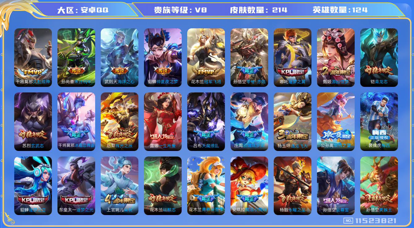 [11523821]V8 10传说 124英雄 214皮肤 典藏英雄武则天 可修改实名 女号 优质装备:冠军飞将,久胜战神,末日机甲-孙尚香(绿蚂蚱),仲夏夜之梦(大飞蛾),零号·赤焰,海洋之心 限定皮:至尊宝,白虎志(电光耗子),梅西,魔法小厨娘,瑞麟志(木兰年限),遇见飞天,青龙志(铠年限),冰锋战神,游园惊梦,梁祝,逐梦之翼,逐梦之音,逐梦之影,逐梦之光,玄武志(苏烈年限),朱雀志(守约年限),永曜之星,辉光之辰,霸王别姬-虞姬,奇迹圣诞,一生所爱,引擎之心,天魔缭乱,青春决赛季,冰霜恋舞曲,云端筑梦师,蜜橘之夏,热情桑巴,神奇女侠,美猴王 史诗皮:东方月初,紫霞仙子,电玩小子(小书包),黄金分割率,千年之狐,偶像歌手,末日机甲-吕布,猫狗日记-孙策,猫狗日记-大乔,乱世虎臣,摇滚巨星,水果甜心,星夜王子,心灵骇客,暗隐猎兽者,纤云弄巧,繁星吟游(呼啦呼啦),缤纷独角兽,水晶猎龙者,箭羽风息,金属风暴,原初追逐者,圣诞恋歌,鹰眼统帅,魅力维加斯,未来纪元-赵云