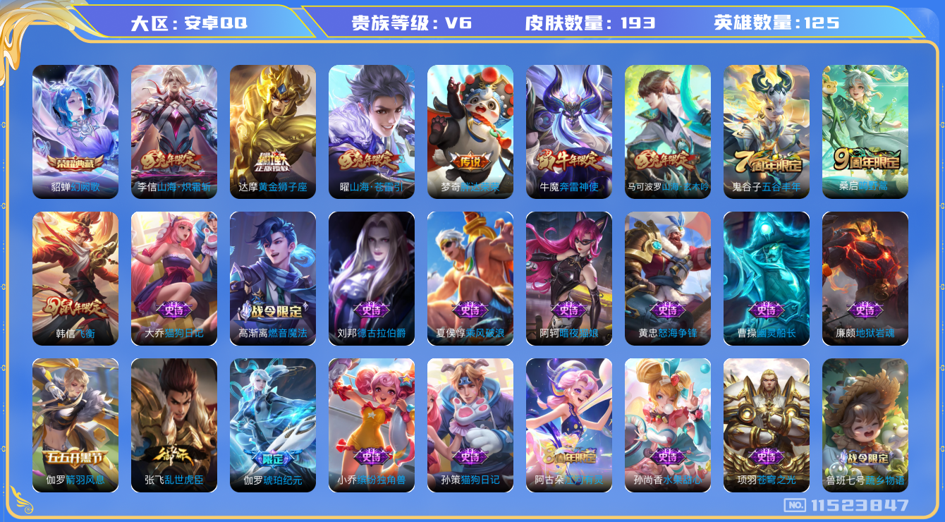 [11523847]V6 1典藏 5传说 125英雄 193皮肤 可修改实名 优质装备:幻阙歌(貂蝉典藏),黄金狮子座,胖达荣荣,山海·炽霜斩(李信年限),山海·苍雷引(电光曜子) 珍宝阁皮:妄想食味,胡桃夹子 限定皮:鸣野蒿,飞衡(韩信年限),五谷丰年,奔雷神使(牛魔年限),山海·玄木吟(马可年限) 史诗皮:龙之律动,怒海争锋,蔬乡物语(鲁班七号),琥珀纪元伽罗,苍穹之光,黄金分割率,特工魅影,江河有灵,高渐离燃音魔法,百解令(蒙犽),冰冠公主,无限星赏官,暗夜猫娘,龙骑士(小龙虾),末日机甲-吕布,猫狗日记-孙策,猫狗日记-大乔,乱世虎臣,摇滚巨星,水果甜心,绅士熊喵,功夫厨神,德古拉伯爵,暗隐猎兽者,幽灵船长,鬼剑武藏,地狱岩魂,纤云弄巧,拒霜思,缤纷独角兽,乘风破浪,逐浪之夏,箭羽风息,金属风暴,圣诞恋歌,鹰眼统帅,魅力维加斯,未来纪元-赵云