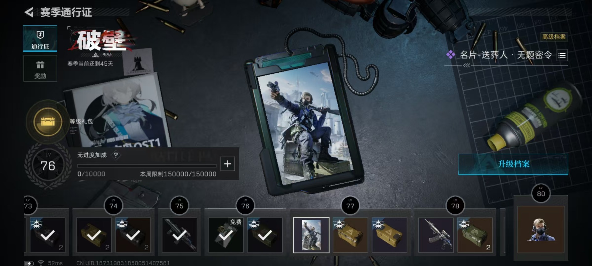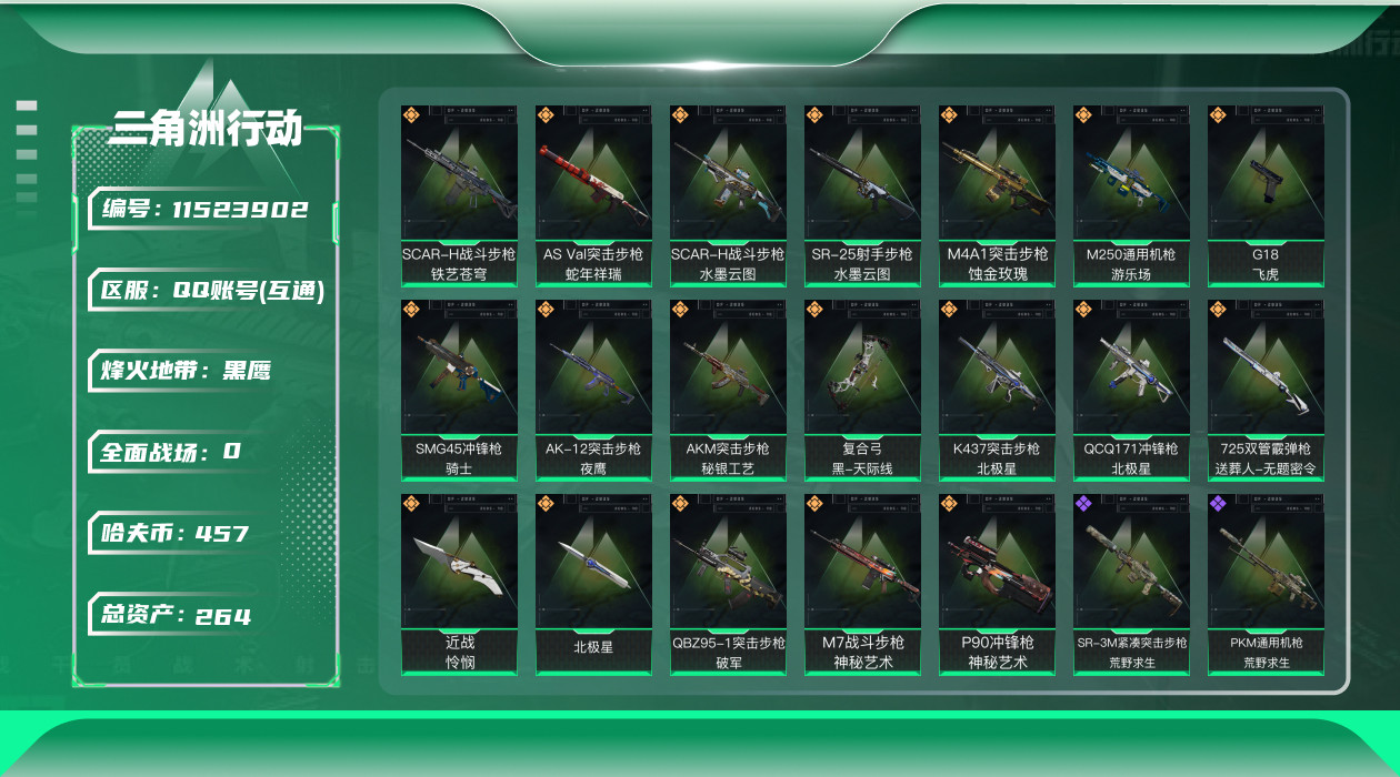 [11523902]可二次 可修改实名 实名:可修改 顶级安全箱(9.17到期) 烽火地带段位:黑鹰 全面战场段位:上等兵 总资产:264.8 哈夫币:457.414 传说武器皮肤:近战-怜悯,近战-北极星,AS Val突击步枪-蛇年祥瑞,SCAR-H战斗步枪-水墨云图,SR-25射手步枪-水墨云图,SCAR-H战斗步枪-铁艺苍穹,AK-12突击步枪-夜鹰,SMG45冲锋枪-骑士,AKM突击步枪-秘银工艺,复合弓-黑-天际线,725双管霰弹枪-送葬人-无题密令,QCQ171冲锋枪-北极星,K437突击步枪-北极星,M250通用机枪-游乐场,G18-飞虎,M4A1突击步枪-蚀金玫瑰,P90冲锋枪-神秘艺术,QBZ95-1突击步枪-破军,M7战斗步枪-神秘艺术 史诗武器皮肤:PKM通用机枪-荒野求生,SR-3M紧凑突击步枪-荒野求生,PSG-1射手步枪-无垢,M250通用机枪-囚徒,SCAR-H战斗步枪-囚徒 干员外观:红狼-蚀金玫瑰,骇爪-水墨云图,威龙-飞虎