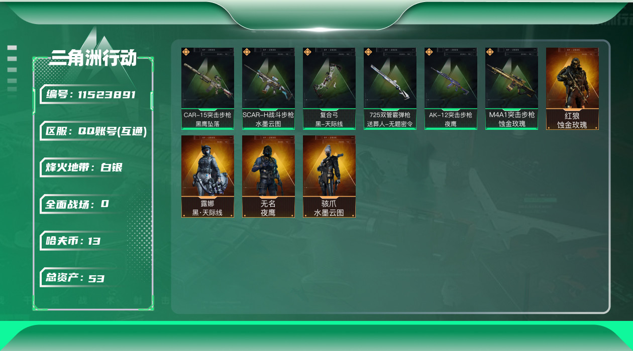 [11523891]可二次 可修改实名 实名:可修改 烽火地带段位:白银 全面战场段位:列兵 高级安全箱(2×3)9.15号到期 总资产:53.6 哈夫币:13.518 传说武器皮肤:SCAR-H战斗步枪-水墨云图,AK-12突击步枪-夜鹰,复合弓-黑-天际线,725双管霰弹枪-送葬人-无题密令,M4A1突击步枪-蚀金玫瑰,CAR-15突击步枪-黑鹰坠落 干员外观:红狼-蚀金玫瑰,骇爪-水墨云图,无名-夜鹰,露娜-黑·天际线
