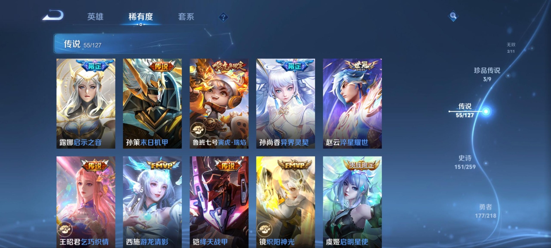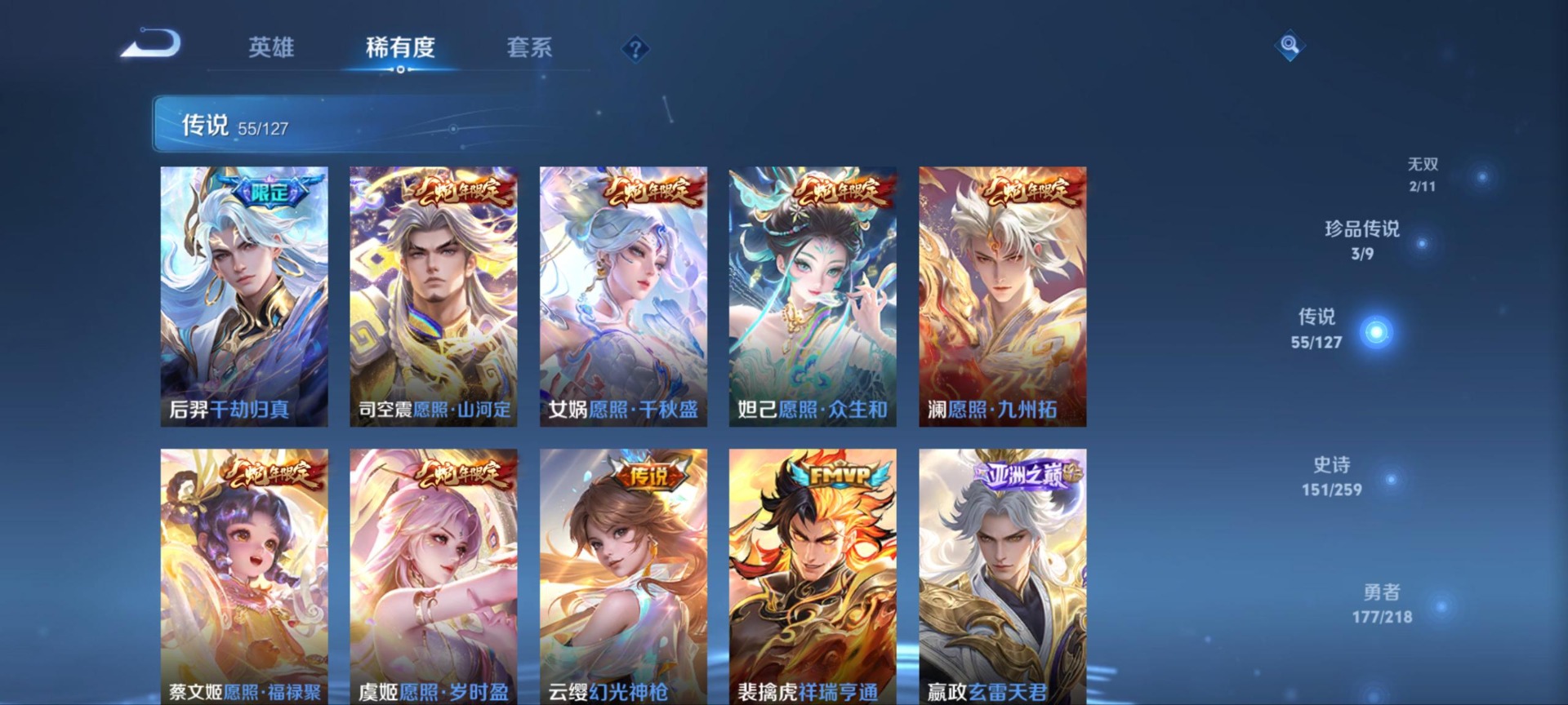 刘备时之恋人,铠绛天战甲,铠冥王哈迪斯,铠琥珀纪元,赵云乘龙·铭钟鼎,张飞百相守梦,赵云淬星耀世,干将莫邪久胜战神,典韦战鼓燎原,李信一念神魔,孙策末日机甲,孙策乘龙·淬吴钩,达摩黄金狮子座,海月金乌负日,王昭君乞巧织情,后羿千劫归真,庄周牧神诗旅,镜炽阳神光,亚连落雪白狼,宫本武藏惊梅引,裴擒虎祥瑞亨通,夏洛特浮生妄,艾琳觅芳踪,西施游龙清影,嬴政玄雷天君,张良黄金白羊座,孙悟空零号·赤焰,曜云鹰飞将,马超琥珀纪元,百里守约碎云,墨子黄金天蝎座,澜逐花归海,云缨幻光神枪