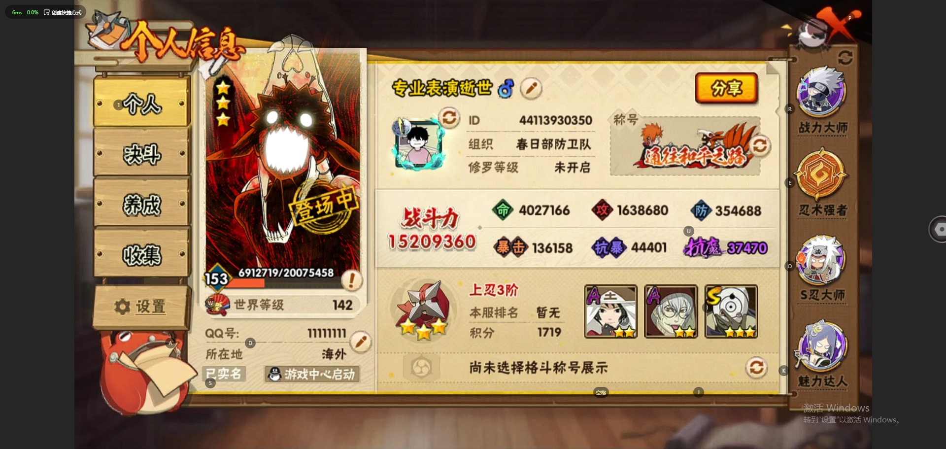 [11523931]V11 28S忍 28A忍 22通灵 1520.9W战力 可二次 可修改实名 优质装备:千手柱间「秽土转生」,罗砂「四代目风影」,宇智波鼬「秽土转生」,佩恩·天道「超」,药师兜「仙人模式」,宇智波斑「秽土转生」,宇智波斑 「木叶创立」,猿飞日斩「秽土转生」,长门「秽土转生」,迈特凯「死门」,宇智波带土 「忍界大战」,“宇智波斑” 「白面具」,漩涡鸣人 「九喇嘛连结」,春野樱 「忍界大战」,宇智波佐助「永恒万花筒」,宇智波斑「秽土转生·解」,大筒木桃式,大筒木舍人 「最终章」,自来也 「传说中的三忍」,漩涡鸣人 「暴怒·第六尾」 S级忍者:大野木 「忍界大战」,自来也 「舞之豪杰」,宇智波鼬 「须佐能乎」,佩恩「天道」,猿飞日斩,波风水门,大蛇丸,纲手