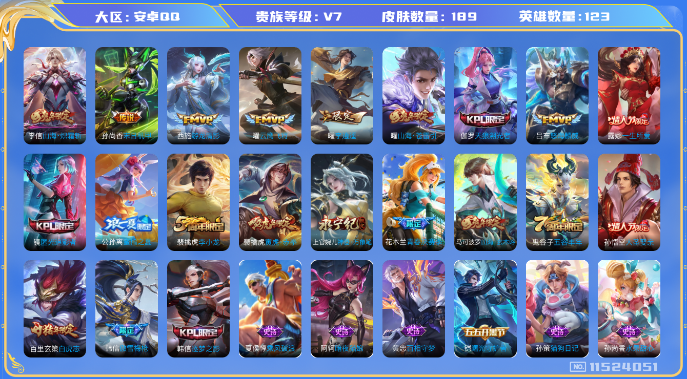 [11524051]V7 9传说 123英雄 189皮肤 可修改实名 优质装备:云鹰飞将(小将军),末日机甲-孙尚香(绿蚂蚱),李逍遥,游龙清影(小青龙),山海·炽霜斩(李信年限),山海·苍雷引(电光曜子) 珍宝阁皮:女武神,玩趣恶龙 限定皮:白虎志(电光耗子),傲雪梅枪,怒海麟威,五谷丰年,天狼溯光者,李小龙,逐梦之影,一生所爱,大圣娶亲,青春决赛季,蜜橘之夏,匿光追影者,寅虎·赤拳(老虎年限),神器·万象笔,山海·玄木吟(马可年限) 史诗皮:百相守梦-黄忠,紫霞仙子,苍穹之光,暗夜猫娘,魅语,猫狗日记-孙策,修罗,女仆咖啡,水果甜心,功夫厨神,暗隐猎兽者,鬼剑武藏,舞动绿茵,纤云弄巧,繁星吟游(呼啦呼啦),拒霜思,乘风破浪,逐浪之夏,水晶猎龙者,曙光守护者,金属风暴,圣诞狂欢,鹰眼统帅,无心,未来纪元-赵云