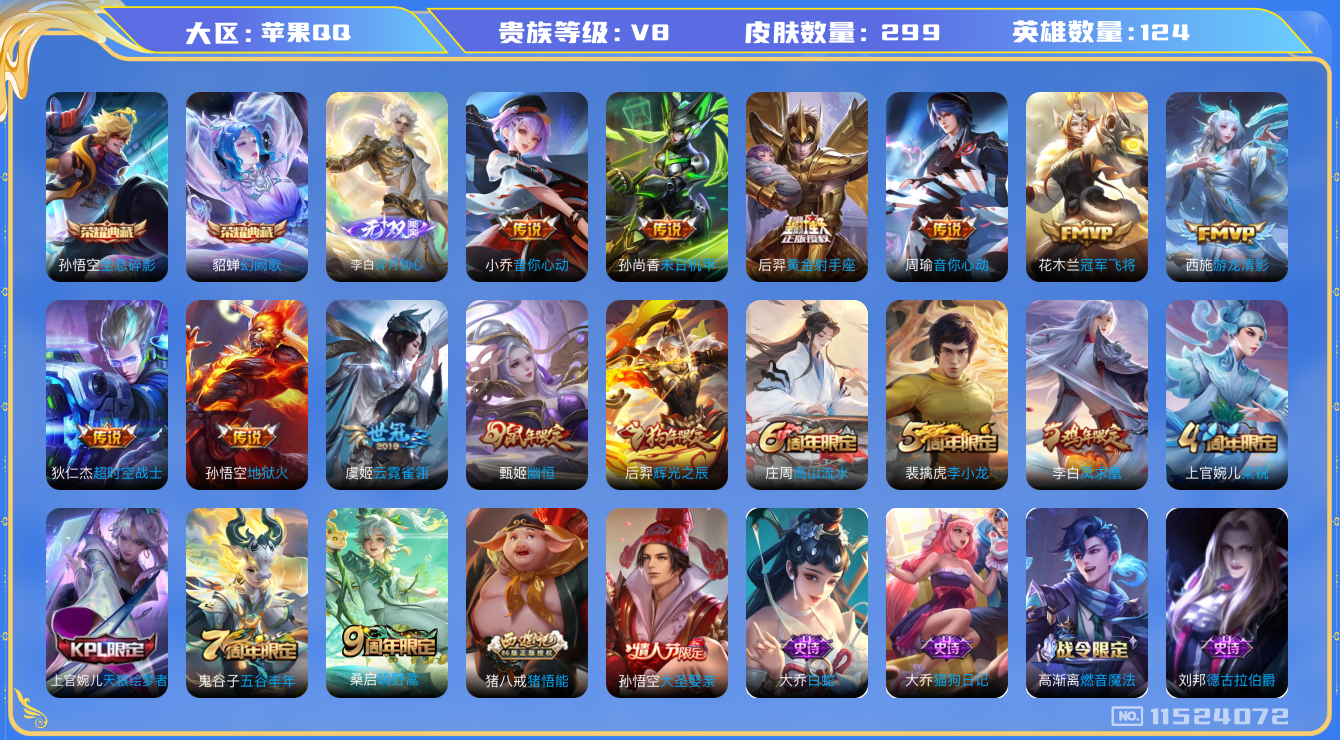 [11524072]V8 2典藏 1无双 12传说 124英雄 299皮肤 可修改实名 荣耀水晶:幻阙歌(貂蝉典藏),全息碎影(猴子典藏) 无双皮:碎月剑心(李白无双) 传说皮:游龙清影(小青龙),黄金射手座,地狱火,末日机甲-孙尚香(绿蚂蚱),云霓雀翎,冠军飞将,音你心动-小乔,音你心动-周瑜,超时空战士-狄仁杰 珍宝阁皮:蔷薇恋人,玩趣恶龙 限定皮:鸣野蒿,凤求凰(白切鸡),高山流水,五谷丰年,幽恒(沐浴露),梁祝,天狼绘梦者,李小龙,辉光之辰,猪悟能,大圣娶亲 史诗皮:茶境仙,器灵·浮梦炉,百相守梦-百里守约,蔬乡物语(鲁班七号),琥珀纪元伽罗,破空之剑,紫霞仙子,苍穹之光,电玩小子(小书包),白龙吟,特工魅影,千年之狐,真我赫兹(百里守约),江河有灵,高渐离燃音魔法,百解令(蒙犽),偶像歌手,无限星赏官,白蛇,龙骑士(小龙虾),末日机甲-吕布,猫狗日记-孙策,猫狗日记-大乔,时之恋人-孙尚香,乱世虎臣,节奏热浪,女仆咖啡,摇滚巨星,水果甜心,天才门将,星夜王子,心灵骇客,功夫厨神,德古拉伯爵,暗隐猎兽者,幽灵船长,鬼剑武藏,心灵战警,地狱岩魂,纤云弄巧,繁星吟游(呼啦呼啦),拒霜思,缤纷独角兽,乘风破浪,逐浪之夏,水晶猎龙者,曙光守护者,箭羽风息,原初追逐者,圣诞狂欢,圣诞恋歌,鹰眼统帅,魅力维加斯,无心
