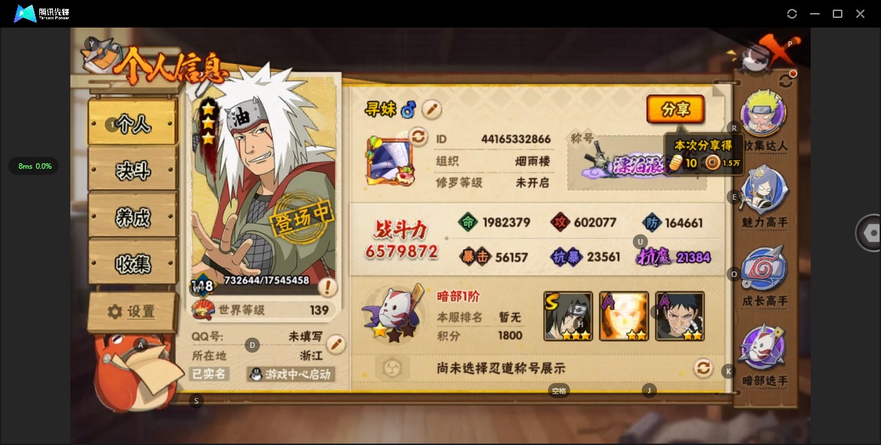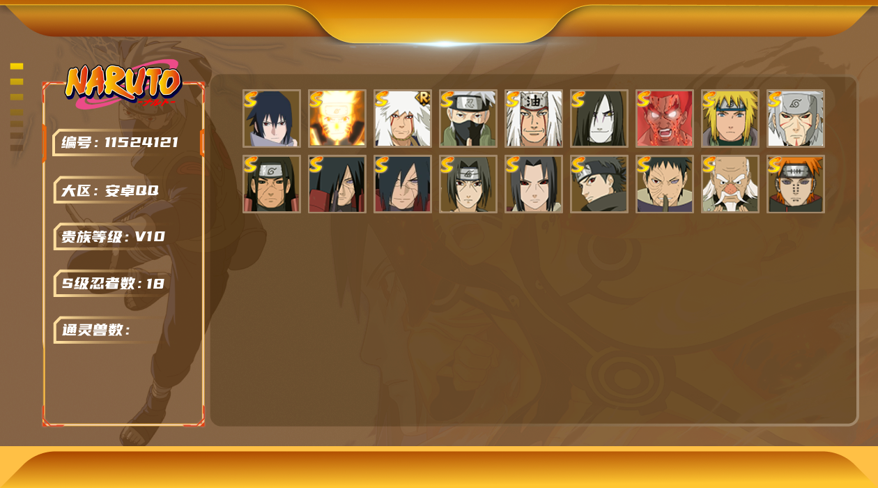 [11524121]V10 18S忍 32A忍 657.9W战力 可二次 可修改实名 优质装备:千手柱间「秽土转生」,宇智波鼬「秽土转生」,宇智波斑「秽土转生」,千手扉间「秽土转生」,迈特凯「死门」,宇智波带土 「忍界大战」,漩涡鸣人 「九喇嘛连结」,宇智波佐助「永恒万花筒」,宇智波斑「秽土转生·解」,宇智波止水「须佐能乎」,旗木卡卡西「须佐能乎」 S级忍者:大野木 「忍界大战」,自来也 「舞之豪杰」,宇智波鼬 「须佐能乎」,佩恩「天道」,波风水门,大蛇丸,自来也