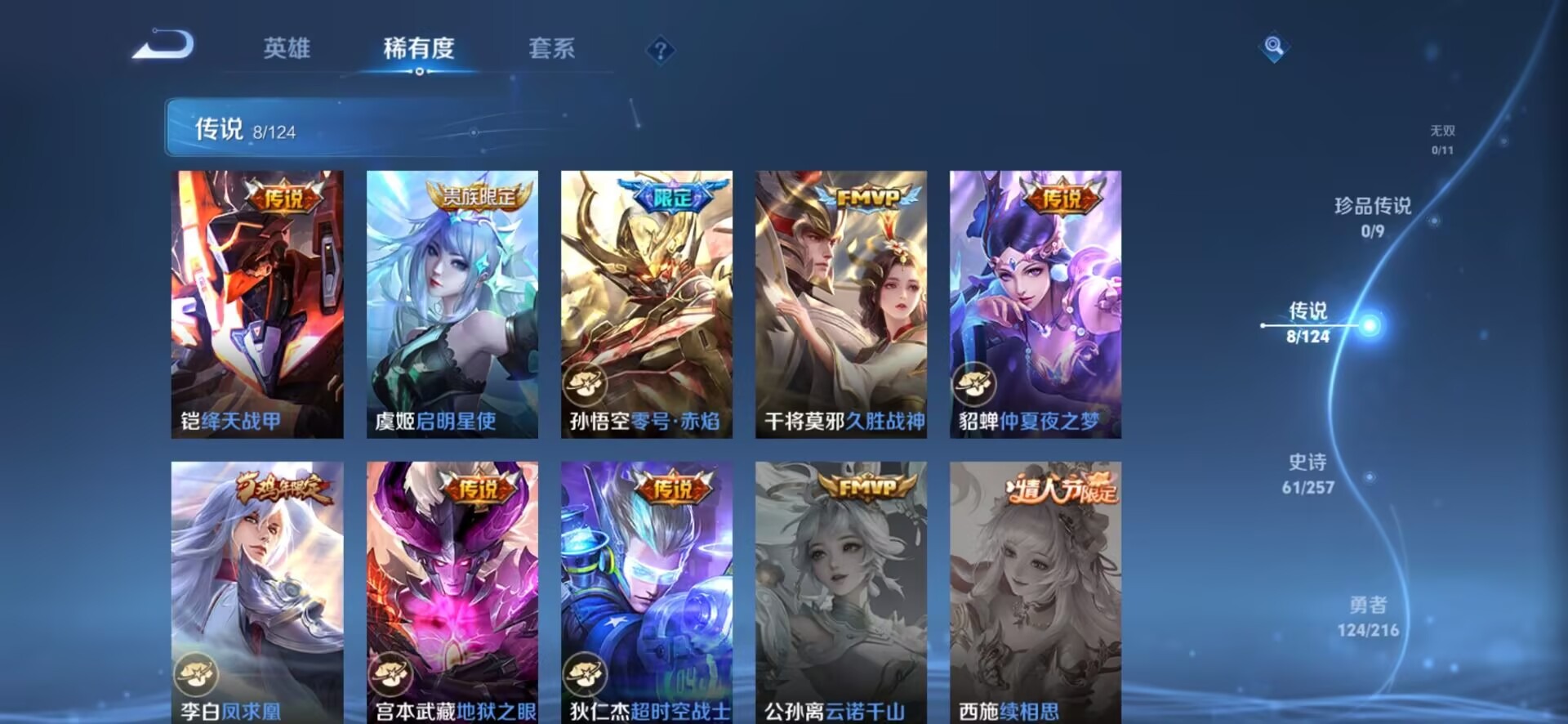 - PX_2081120-贵族等级: V8 英雄数: 123 皮肤数: 255 荣耀水晶: 鸣剑·曳影,全息碎影 传说皮: 云鹰飞将,澜逐花归海 限定皮: 冰锋战神,李小龙,梁祝,至尊宝,如梦令-后羿,高山流水,五谷丰年