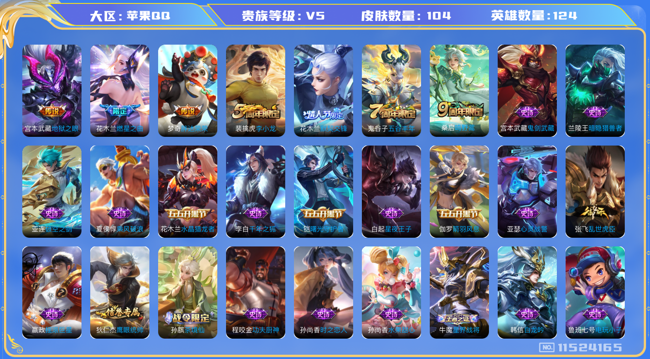 [11524165]V5 4传说 124英雄 104皮肤 可修改实名 优质装备:地狱之眼,胖达荣荣,燃星之曲 珍宝阁皮:妄想食味 限定皮:鸣野蒿,五谷丰年,李小龙,默契交锋-花木兰 史诗皮:星界战将,茶境仙,破空之剑,电玩小子(小书包),白龙吟,特工魅影,千年之狐,蒙恬荣光圣徽,偶像歌手,时之恋人-孙尚香,乱世虎臣,修罗,摇滚巨星,水果甜心,星夜王子,功夫厨神,暗隐猎兽者,鬼剑武藏,心灵战警,乐园奇幻夜,乘风破浪,水晶猎龙者,曙光守护者,箭羽风息,金属风暴,圣诞狂欢,鹰眼统帅,魅力维加斯