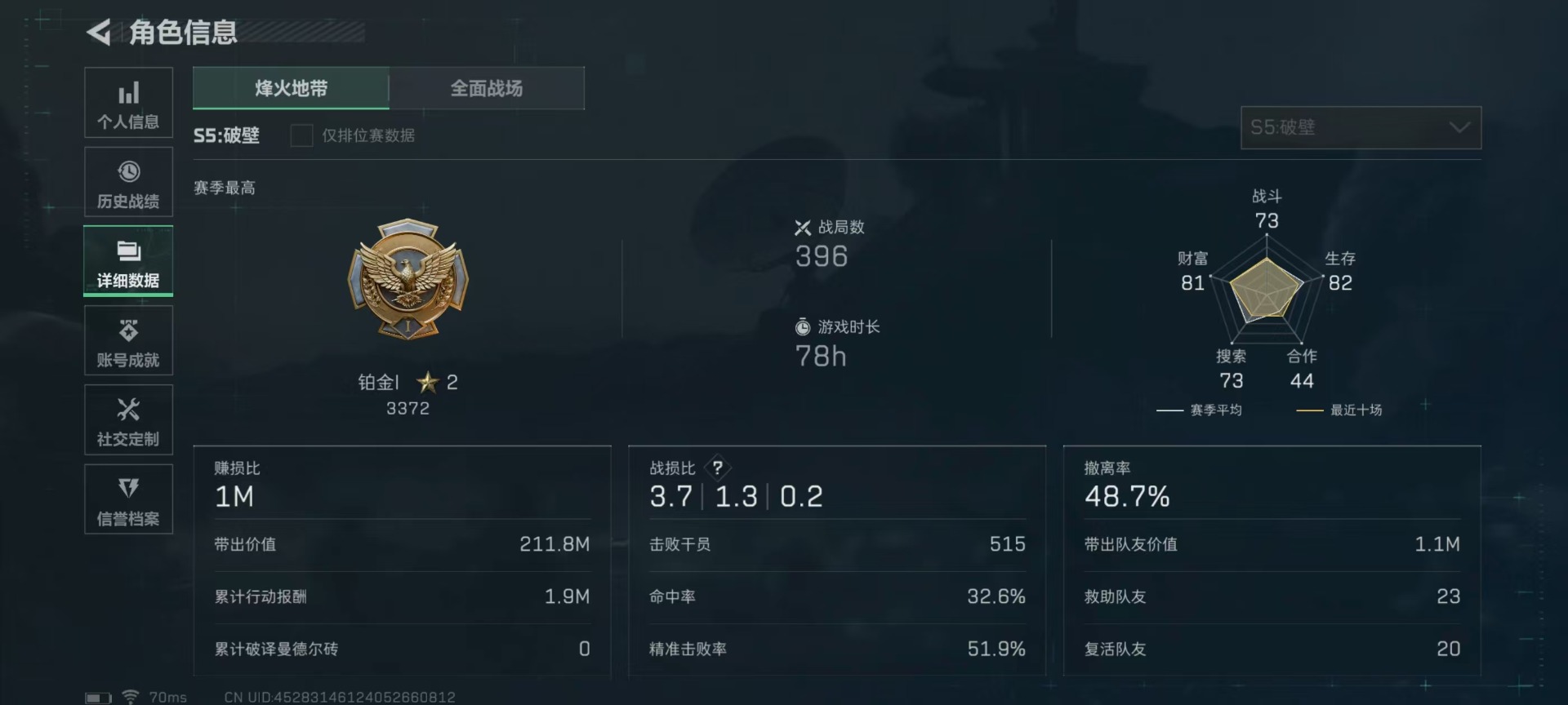 - [11642306]总资产:294.8M 6干员外观 1近战传说 15传说枪械 哈夫币:155K 可二次 可修改实名安全保护中 优质装备:近战-北极星,顶级安全箱(3x3),非洲之心 烽火地带段位:三角洲巅峰 全面战场段位:尉官 传说武器皮肤:SR-25射手步枪-水墨云图,SCAR-H战斗步枪-铁艺苍穹,AK-12突击步枪-夜鹰,SMG45冲锋枪-骑士,复合弓-黑-天际线,AWM狙击步枪-捞点薯条,QCQ171冲锋枪-北极星,腾龙突击步枪-捞点薯条,93R-捞点薯条,勇士冲锋枪-能天使-午夜邮差,725双管霰弹枪-送葬人-无题密令,K437突击步枪-北极星,M7战斗步枪-维京,M4A1突击步枪-蚀金玫瑰 史诗武器皮肤:SR-3M紧凑突击步枪-英雄,QBZ95-1突击步枪-ACE,M4A1突击步枪-特勤执行,AUG突击步枪-特勤执行,Vector冲锋枪-红色彗星,PTR-32战斗步枪-ACE,SKS射手步枪-ACE,AUG突击步枪-蝮蛇,PKM通用机枪-蝮蛇,G3战斗步枪-战场英杰,M700狙击步枪-守夜人,Ash-12战斗步枪-守夜人,SR-3M紧凑突击步枪-荒野求生,勇士冲锋枪-深海恐惧,SG552突击步枪-深海恐惧,SVD狙击步枪-荒野求生,M14射手步枪-禁卫,M1014霰弹枪-林中猎手,PSG-1射手步枪-无垢,AS Val突击步枪-典狱官,QCQ171冲锋枪-禁卫,QBZ95-1突击步枪-曙光,UZI冲锋枪-危险实验,M249轻机枪-维京,SCAR-H战斗步枪-危险实验,沙漠之鹰-曙光,Vector冲锋枪-阿萨拉文明,SVD狙击步枪-阿萨拉工艺,S12K霰弹枪-曙光,AS Val突击步枪-刀锋,PKM通用机枪-英雄,M700狙击步枪-竞技风,QSZ92G-风林火山,93R-博士 干员外观:红狼-蚀金玫瑰,牧羊人-街头之王,无名-夜鹰,威龙-飞虎,蜂医-送葬人·无题密令(S5),露娜-黑·天际线