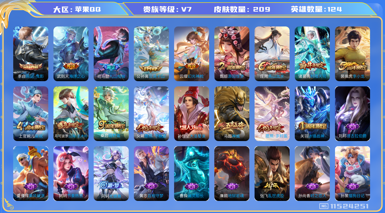 [11524251]V7 1典藏 8传说 124英雄 209皮肤 可修改实名 优质装备:鸣剑·曳影,海洋之心 传说皮:九山相柳,云诺千山,幻光神枪 珍宝阁皮:女武神,玩趣恶龙 限定皮:愿照·岁时盈(虞姬年限),愿照·千秋盛(女娲年限),鸣野蒿,时雨天司(水龙头),神威(电光马子),高山流水,冰锋战神,游园惊梦,梁祝,李小龙,大圣娶亲,山海·玄木吟(马可年限) 史诗皮:器灵·浮梦炉,化蝶舞,星界战将,龙之律动,百相守梦-周瑜,百相守梦-黄忠,紫霞仙子,特工魅影,江河有灵,蒙恬荣光圣徽,冰冠公主,末日机甲-吕布,猫狗日记-孙策,时之恋人-孙尚香,乱世虎臣,节奏热浪,女仆咖啡,水果甜心,绅士熊喵,天才门将,功夫厨神,德古拉伯爵,暗隐猎兽者,幽灵船长,鬼剑武藏,暗渊魔法,地狱岩魂,纤云弄巧,乘风破浪,水晶猎龙者,金属风暴,原初追逐者,圣诞恋歌,鹰眼统帅,暗夜贵公子,黎明之约,无心