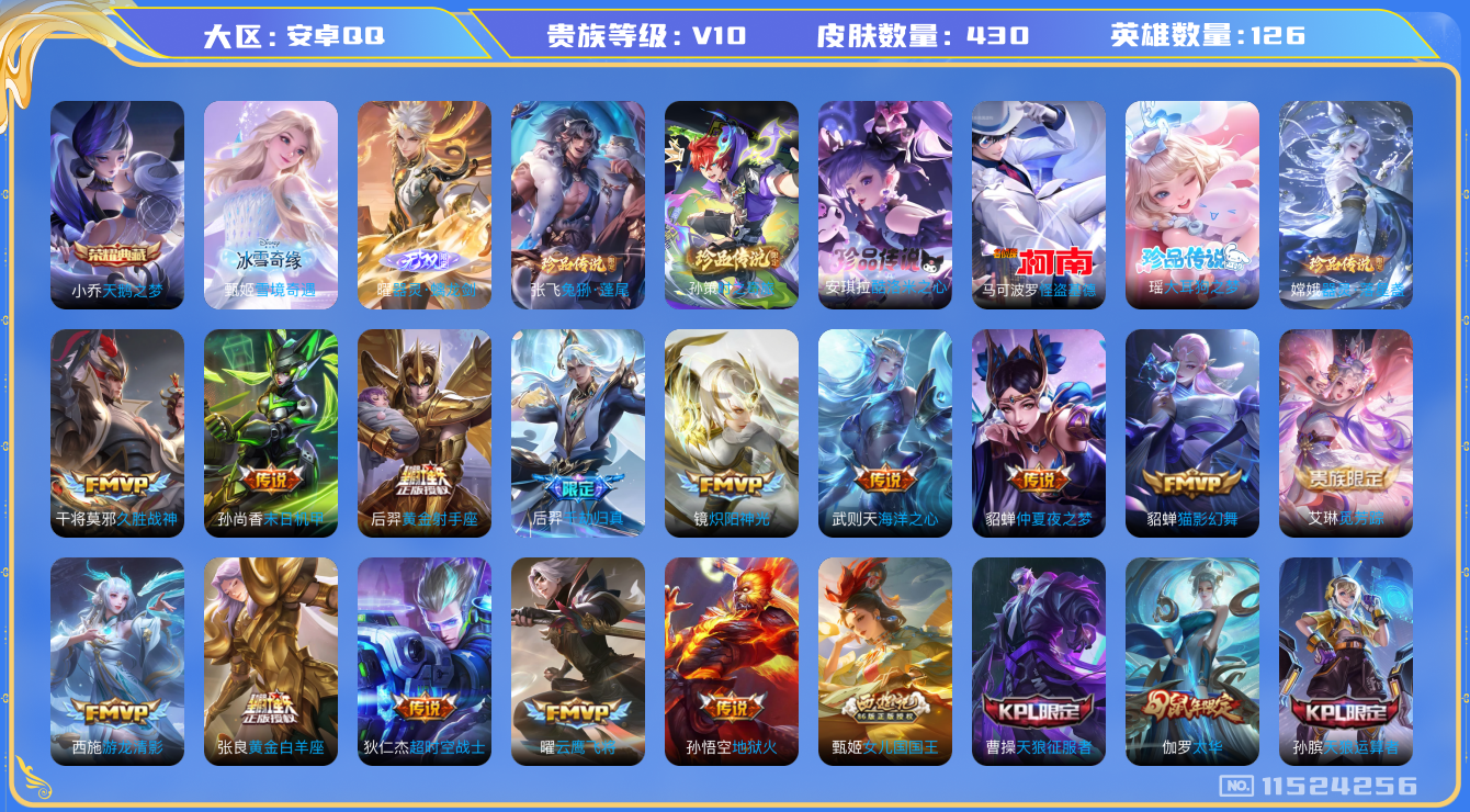 [11524256]V10 1典藏 2无双 6珍品传说 27传说 126英雄 430皮肤 典藏英雄武则天 女号 可修改实名 优质装备:天鹅之梦(小乔典藏),雪境奇遇-甄姬,器灵·螭龙剑,怪盗基德,器灵·落星盏,酷洛米之心,大耳狗之梦,黄金射手座,云鹰飞将(小将军),黄金白羊座,猫影幻舞,久胜战神,炽阳神光,末日机甲-孙尚香(绿蚂蚱),地狱火,仲夏夜之梦(大飞蛾),海洋之心,游龙清影(小青龙),超时空战士-狄仁杰,艾琳觅芳踪,千劫归真 珍品传说:时之奇旅-孙策,兔狲·蓬尾 珍宝阁皮:妄想食味,蔷薇恋人,女武神 限定皮:愿照·九州拓(澜年限),愿照·福禄聚(蔡文姬年限),愿照·岁时盈(虞姬年限),愿照·山河定(司空震年限),愿照·众生和(妲己年限),愿照·千秋盛(女娲年限),逐霄战戟,鸣野蒿,白虎志(电光耗子),太华(伽罗年限),时之彼端,时雨天司(水龙头),神威(电光马子),遇见飞天,高山流水,五谷丰年,冰锋战神,天狼运算者,逐梦之音,天狼征服者,祈雪灵祝(雪兔子),天狼绘梦者,李小龙,逐梦之影,朱雀志(守约年限),辉光之辰,如梦令-嫦娥,如梦令-后羿,猪悟能,大圣娶亲,青春决赛季,冰霜恋舞曲,蜜橘之夏,神奇女侠,女儿国国王,时之祈愿-瑶(瑶传限),冰霜神祇 史诗皮:鸭鸭历险记-刘禅,器灵·浮梦炉,化蝶舞,星界战将,灵蛊蚀心,龙之律动,石田雨龙,百相守梦-周瑜,茶境仙,蔬乡物语(鲁班七号),百相守梦-百里守约,百相守梦-黄忠,遇见神鹿,紫霞仙子,苍穹之光,电玩小子(小书包),黄金分割率,特工魅影,千年之狐,电玩·爆裂旋风,江河有灵,雪夜绮愿(周瑜),蒙恬荣光圣徽,偶像歌手,龙骑士(小龙虾),白蛇,暗夜猫娘,魅语,无限星赏官,晚萤,冰冠公主,青蛇,末日机甲-吕布,猫狗日记-孙策,猫狗日记-大乔,时之恋人-孙尚香,乱世虎臣,节奏热浪,修罗,女仆咖啡,摇滚巨星,水果甜心,绅士熊喵,天才门将,星夜王子,心灵骇客,功夫厨神,德古拉伯爵,暗隐猎兽者,幽灵船长,鬼剑武藏,心灵战警,天秀·启明,舞动绿茵,地狱岩魂,诗语江南,纤云弄巧,繁星吟游(呼啦呼啦),拒霜思,缤纷独角兽,乘风破浪,逐浪之夏,月团寄思,水晶猎龙者,曙光守护者,箭羽风息,金属风暴,原初追逐者,圣诞狂欢,圣诞恋歌,鹰眼统帅,暗夜贵公子,魅力维加斯,黎明之约,赏金猎手,奇遇舞章,无心,