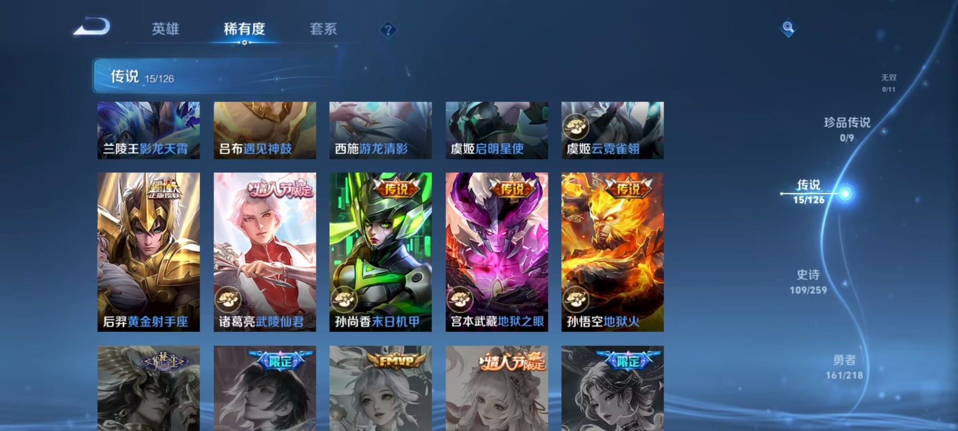 - PX_2083179-38 安卓QQ/最强王者/288皮肤/124英雄/1典藏/1珍品无双/2无双/6珍品传说/31传说/79史诗/9稀有英雄 【1 珍品无双】馥梦繁花, 【6 珍品传说】酷洛米之心 安琪拉,大耳狗之梦 瑶,朽木白哉 暃,黑崎一护 宫本武藏,器灵·落星盏 嫦娥,兔狲·蓬尾 张飞, 【1 典藏皮肤】最初的交响 伽罗, 【2 无双皮肤】时之魔女 小乔,器灵·螭龙剑 曜, 【31 传说皮