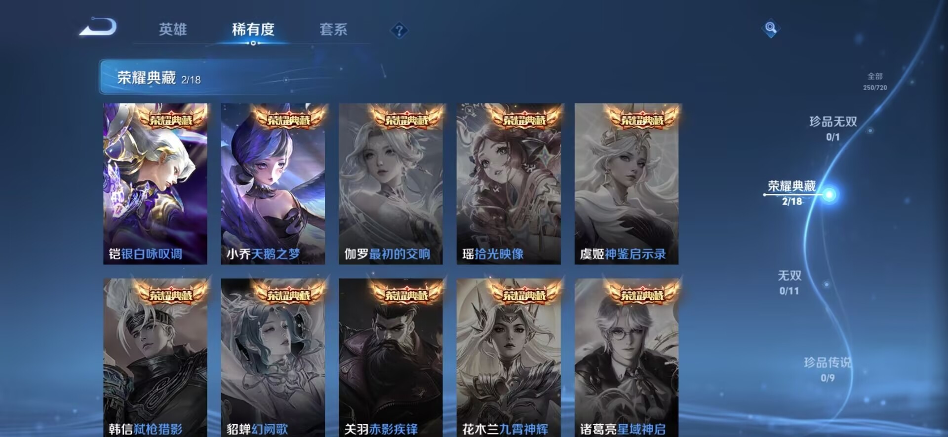 - PX_2072299-66 安卓QQ/永恒钻石/474皮肤/126英雄/3典藏/0珍品无双/1无双/2珍品传说/65传说/150史诗/10稀有英雄 【2 珍品传说】怪盗基德 马可波罗,江户川柯南 鲁班七号, 【3 典藏皮肤】天鹅之梦 小乔,神鉴启示录 虞姬,拾光映像 瑶, 【1 无双皮肤】花合斗 不知火舞, 【65 传说皮肤】胖达荣荣 梦奇,鹤归松栖 云缨,星穹之声 王昭君,启明星使 虞姬,云霓雀