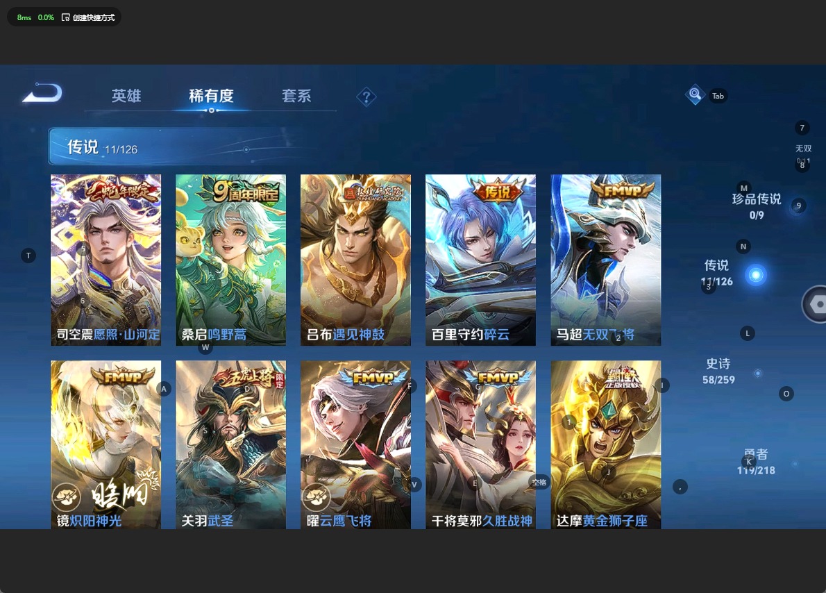 - PX_2081511-实名: 可修改 贵族等级: V7 英雄数: 123 皮肤数: 261 荣耀水晶: 幻阙歌 珍品传说: 黑崎一护 传说皮: 黄金狮子座,末日机甲-孙尚香,地狱之眼,超时空战士-狄仁杰,霜月吟 限定皮: 李小龙,游园惊梦,梁祝,时雨天司,引擎之心,神威,青春决赛季,逐梦之影,凤求凰,至尊宝,五谷丰年,愿照·山河定