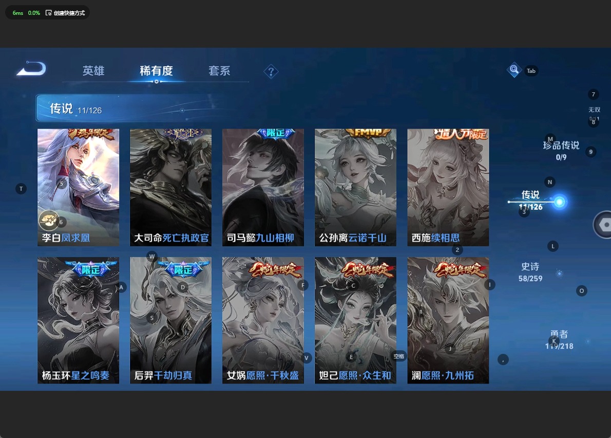 - [12265973]V6 1典藏 1珍品传说 6传说 125英雄 166皮肤 可修改实名 优质装备:弑枪猎影(韩信典藏),怪盗基德,黄金白羊座,久胜战神 传说皮:幻光神枪 珍宝阁皮:优雅恋人,蔷薇恋人 限定皮:愿照·九州拓(澜年限),愿照·千秋盛(女娲年限),逐霄战戟,鸣野蒿,遇见飞天,高山流水,五谷丰年 史诗皮:器灵·浮梦炉,化蝶舞,星界战将,谪仙醉月,茶境仙,破空之剑,琥珀纪元伽罗,蔬乡物语(鲁班七号),百相守梦-百里守约,百相守梦-黄忠,紫霞仙子,苍穹之光,黄金分割率,特工魅影,千年之狐,江河有灵,魅语,蒙恬荣光圣徽,冰冠公主,偶像歌手,龙骑士(小龙虾),末日机甲-吕布,猫狗日记-孙策,节奏热浪,女仆咖啡,水果甜心,心灵骇客,功夫厨神,德古拉伯爵,暗隐猎兽者,幽灵船长,鬼剑武藏,心灵战警,乐园奇幻夜,天秀·启明,拒霜思,缤纷独角兽,乘风破浪,逐浪之夏,月团寄思,水晶猎龙者,曙光守护者,箭羽风息,唤灵魅影,金属风暴,原初追逐者,鹰眼统帅,暗夜贵公子,无心,未来纪元-赵云
