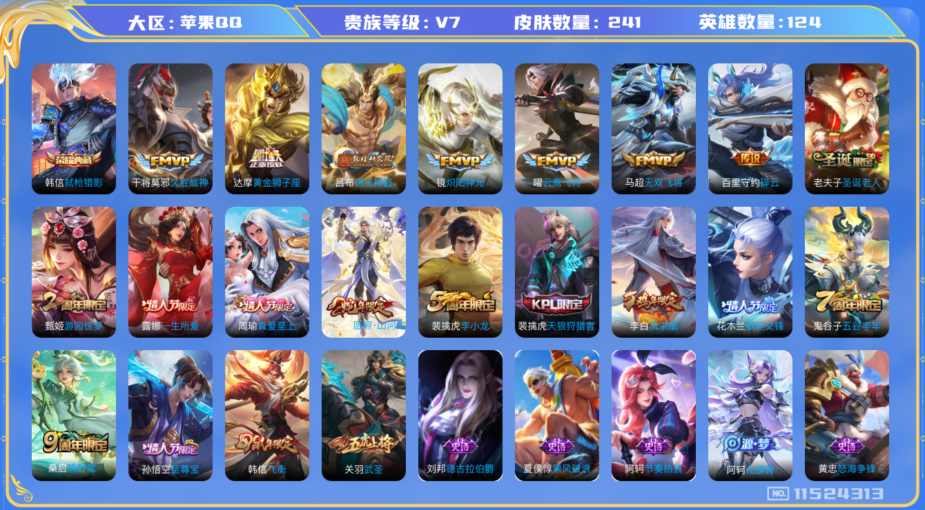 [11524313]V7 1典藏 11传说 124英雄 241皮肤 可修改实名 优质装备:弑枪猎影(韩信典藏),黄金狮子座,云鹰飞将(小将军),久胜战神,炽阳神光,无双飞将,碎云,遇见神鼓 珍宝阁皮:妄想食味 限定皮:愿照·山河定(司空震年限),鸣野蒿,至尊宝,凤求凰(白切鸡),飞衡(韩信年限),五谷丰年,武圣,游园惊梦,天狼狩猎者,李小龙,圣诞老人,默契交锋-花木兰,真爱至上,一生所爱 史诗皮:器灵·浮梦炉,绮世丹青,化蝶舞,龙之律动,破空之剑,蒙犽顽岩魄,怒海争锋,决胜骁骑,蔬乡物语(鲁班七号),紫霞仙子,电玩小子(小书包),特工魅影,无限星赏官,冰冠公主,节奏热浪,修罗,摇滚巨星,水果甜心,天才门将,星夜王子,德古拉伯爵,暗隐猎兽者,鬼剑武藏,纤云弄巧,繁星吟游(呼啦呼啦),乘风破浪,逐浪之夏,月团寄思,水晶猎龙者,曙光守护者,金属风暴,鹰眼统帅,魅力维加斯,赏金猎手,未来纪元-赵云