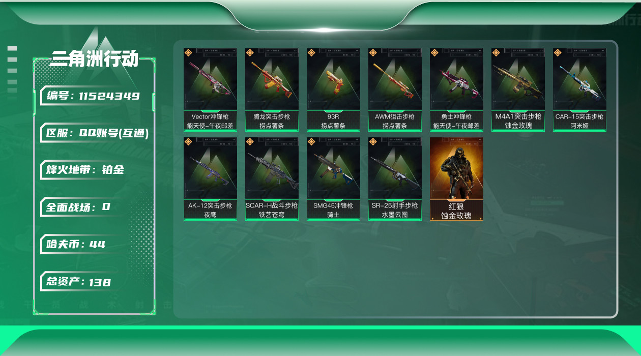 [11524349]总资产:138.5M 1干员外观 11传说枪械 哈夫币:44.557K 可二次 可修改实名 烽火地带段位:铂金 全面战场段位:无段位 传说武器皮肤:SR-25射手步枪-水墨云图,SCAR-H战斗步枪-铁艺苍穹,SMG45冲锋枪-骑士,AWM狙击步枪-捞点薯条,腾龙突击步枪-捞点薯条,93R-捞点薯条,勇士冲锋枪-能天使-午夜邮差,Vector冲锋枪-能天使-午夜邮差,CAR-15突击步枪-阿米娅,AK-12突击步枪-夜鹰,M4A1突击步枪-蚀金玫瑰 干员外观:红狼-蚀金玫瑰