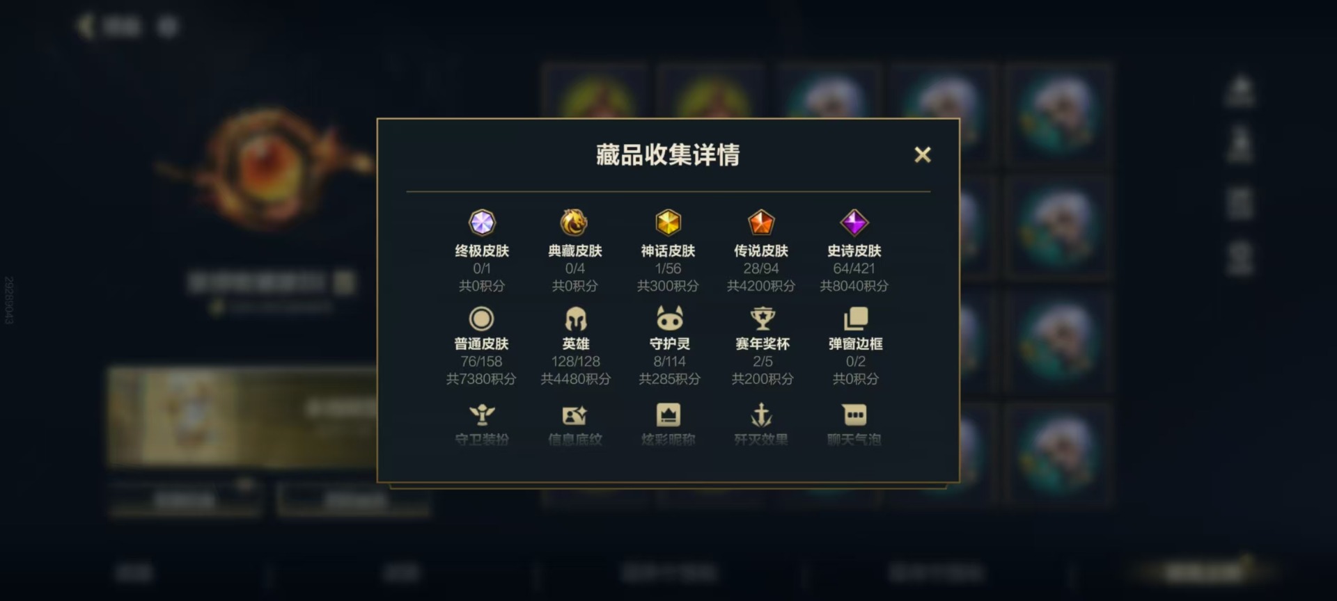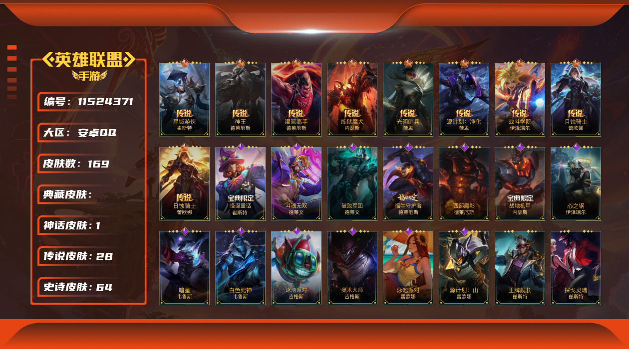 [11524371]可二次 可修改实名 1神话 28传说 64史诗 169皮肤 128英雄 黄金 皮肤:崔斯特-怪诞童话,崔斯特-王牌舰长,崔斯特-星域游侠,崔斯特-探戈灵魂,崔斯特-逍遥赌侠,德莱文-斗魂无双,德莱文-绯金战斧,德莱文-破败军团,德莱文-德莱德莱,德莱文-金牌主播,德莱厄斯-福牛守护者,德莱厄斯-西部魔影,德莱厄斯-热血班长,德莱厄斯-神王,德莱厄斯-灌篮高手,内瑟斯-战地机甲,内瑟斯-单身贵族,内瑟斯-创世魔神,内瑟斯-炼狱魔犬,薇恩-光明哨兵,薇恩-猎龙勇士,薇恩-源计划:净化,薇恩-苍穹之光,伊泽瑞尔-心之钢,伊泽瑞尔-冰川勇者,伊泽瑞尔-战斗学院,伊泽瑞尔-光执事,韦鲁斯-迅箭,韦鲁斯-暗星,韦鲁斯-苍穹之光,韦鲁斯-白色死神,吉格斯-龙冕神策,吉格斯-科学狂人,吉格斯-泳池派对,吉格斯-奥术大师,艾希-王牌司令,艾希-黑暗骑士,艾希-女皇,艾希-极地女神,蕾欧娜-月蚀骑士,蕾欧娜-日蚀骑士,蕾欧娜-泳池派对,蕾欧娜-源计划:山,蔚-双城之战,蔚-女警官,蔚-铁拳执事,蔚-炼狱魔女,卡莎-星之守护者,卡莎-K/DA ALL OUT,卡莎-弹幕天使,烬-龙冕异士,烬-暗星尊,烬-源计划:升华,嘉文四世-王牌上将,嘉文四世-福牛守护者,嘉文四世-暗星,易-神龙尊者 驭风啸龙,易-源计划:林,易-暗影,亚索-战场之王,亚索-西部牛仔,亚索-黑夜使者,菲奥娜-绯金丽刃,菲奥娜-皇家守卫,菲奥娜-源计划:火,杰斯-神奇先驱,杰斯-光明之锤,杰斯-蔷薇绅士,凯南-超武乾坤:电弧,凯南-超级英雄,凯南-刺客信条,雷克顿-黯晶巨鳄,雷克顿-源计划:泯灭,雷克顿-鳄霸,娜美-绯金鲛灵,娜美-玉剑传说 寒潭夭夭,娜美-鲛妮座人,锐雯-光明哨兵,锐雯-玉剑传说 武剑仙,锐雯-电玩勇者,金克丝-双城之战,金克丝-星之守护者,金克丝-光耀之芒,艾瑞莉娅-斗魂无双,艾瑞莉娅-光明哨兵,艾瑞莉娅-冰霜之刃,黛安娜-光明哨兵,黛安娜-无限烈焰,黛安娜-暗黑女武神,加里奥-地狱火,加里奥-风执事,加里奥-地狱之门卫士,奥拉夫-王牌勇将,奥拉夫-猎龙勇士,奥拉夫-黑暗骑士,拉莫斯-制胜金球,拉莫斯-熔火之心,阿利斯塔-福牛守护者,阿利斯塔-哞利斯塔,盖伦-神王,盖伦-钢铁军团,亚托克斯-海魔至尊,亚托克斯-霸天剑魔,希瓦娜-银河魔装机神,希瓦娜-冰霜亚龙,阿木木-小小骑士,阿木木-惊悚派对