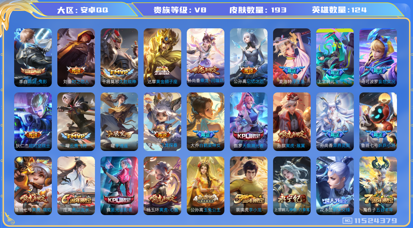 [11524379]V8 1典藏 15传说 124英雄 193皮肤 可修改实名 优质装备:鸣剑·曳影,黄金狮子座,云鹰飞将(小将军),久胜战神,飞鸢探春,李逍遥,时之恋人-刘备(电焊工),超时空战士-狄仁杰,浮生妄,记忆之芯(机甲兔),妄想实况,妄想奇谈 传说皮:乘龙·问璇玑(孙尚香年限) 珍宝阁皮:女武神 限定皮:异界灵契(白毛香),寅虎·展翼(孙膑年限),白鹤梁神女,白晶晶,神威(电光马子),高山流水,五谷丰年,天狼溯光者,李小龙,朱雀志(守约年限),默契交锋-花木兰,乒乒小将,匿光追影者,寅虎·瑞焰(虎皮蛋子),寅虎·心曲(虎婆),玉兔公主,神器·万象笔 史诗皮:蒙犽顽岩魄,埋骨钱,怒海争锋,上官婉儿群星魔术团,蔬乡物语(鲁班七号),琥珀纪元伽罗,遇见神鹿,电玩小子(小书包),特工魅影,匿光破解者,百相守梦(刘备),电玩·爆裂旋风,鹤归松栖(赵怀真),末日机甲-莱西奥,江河有灵,百解令(蒙犽),高渐离燃音魔法,蒙恬荣光圣徽,白蛇,魅语,晚萤,末日机甲-吕布,猫狗日记-孙策,猫狗日记-大乔,时之恋人-孙尚香,乱世虎臣,节奏热浪,女仆咖啡,水果甜心,绅士熊喵,心灵骇客,暗隐猎兽者,鬼剑武藏,舞动绿茵,纤云弄巧,拒霜思,缤纷独角兽,逐浪之夏,水晶猎龙者,金属风暴,圣诞恋歌,鹰眼统帅,魅力维加斯,赏金猎手,滕王阁序,无心,未来纪元-赵云