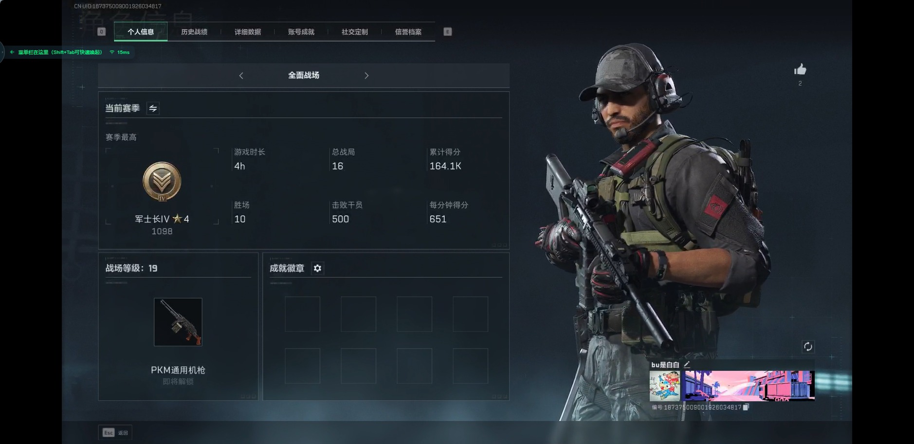 [11524390]总资产:203.5 3传说枪械 进阶安全箱 (9.17到期) 可二次 可修改实名 烽火地带段位:铂金 全面战场段位:军士长 哈夫币:110 传说武器皮肤:复合弓-黑-天际线,CAR-15突击步枪-阿米娅,勇士冲锋枪-能天使-午夜邮差 史诗武器皮肤:M16A4突击步枪-竞赛选手,SV-98狙击步枪-林中猎手,SV-98狙击步枪-囚徒,SCAR-H战斗步枪-囚徒
