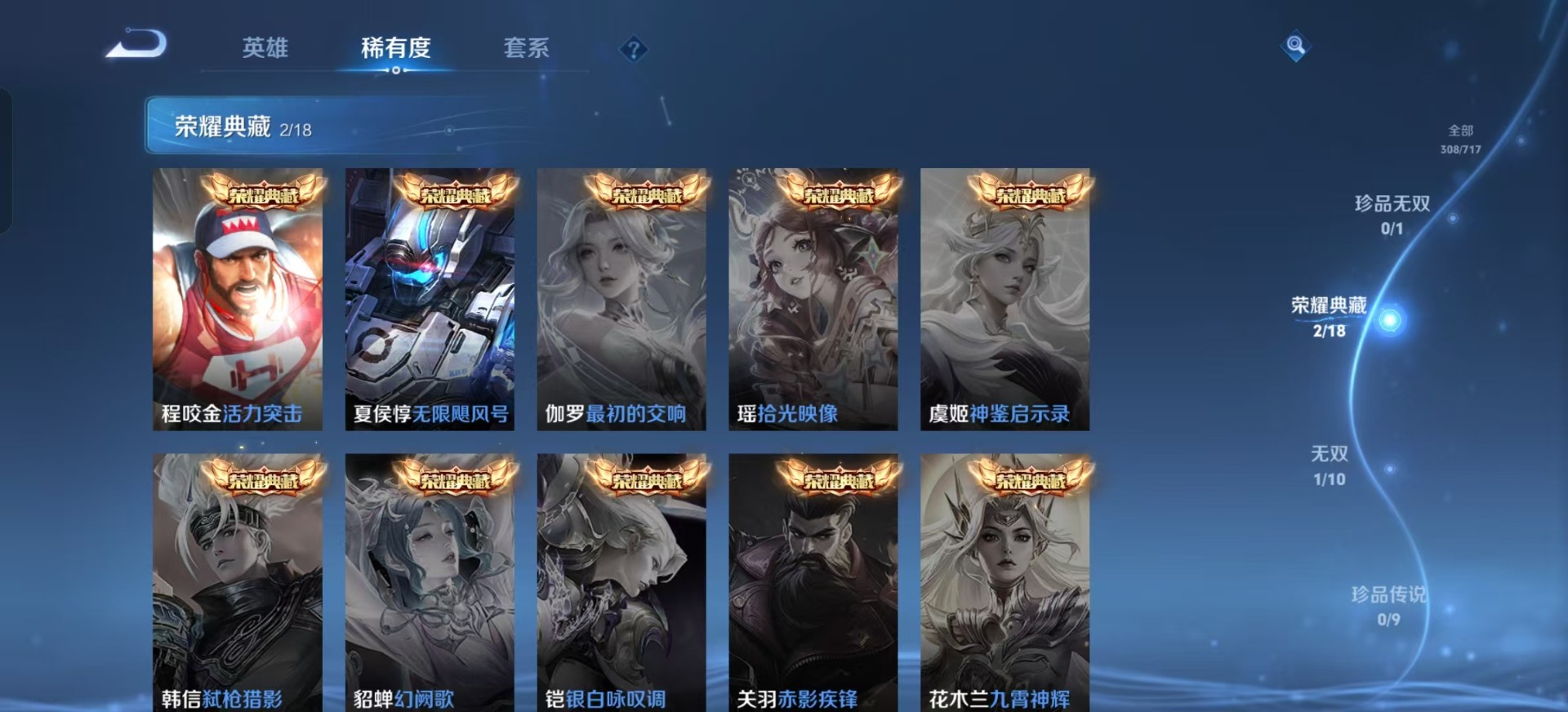 夏侯惇匿光决锋者,廉颇寅虎·御盾,苏烈玄武志,后羿辉光之辰,庄周云端筑梦师,诸葛亮时雨天司,公孙离蜜橘之夏,裴擒虎李小龙,上官婉儿梁祝,李白诗剑行,花木兰瑞麟志,马可波罗山海·玄木吟,桑启鸣野蒿,猪八戒猪悟能,孙悟空孙行者,孙悟空大圣娶亲,孙悟空至尊宝,赵云引擎之心,韩信傲雪梅枪,墨子降魔,虞姬愿照·岁时盈,关羽冰锋战神