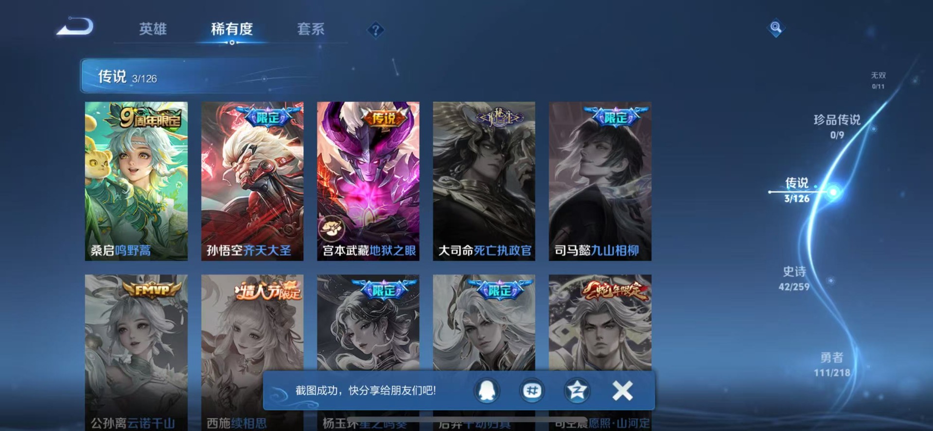 - PX_2108464-实名: 不可修改 英雄数: 124 皮肤数: 262 荣耀水晶: 武则天,星空梦想,无限飓风号,鸣剑·曳影,全息碎影 传说皮: 黄金狮子座,黄金射手座,冠军飞将,绛天战甲,久胜战神,一念神魔,云霓雀翎,末日机甲-孙尚香,地狱火,仲夏夜之梦,海洋之心,李逍遥,游龙清影,无双飞将,山海·炽霜斩 限定皮: 李小龙,梁祝,引擎之心,烈魂,岱宗,神威,蜜橘之夏,太华,天狼征服者,青春决