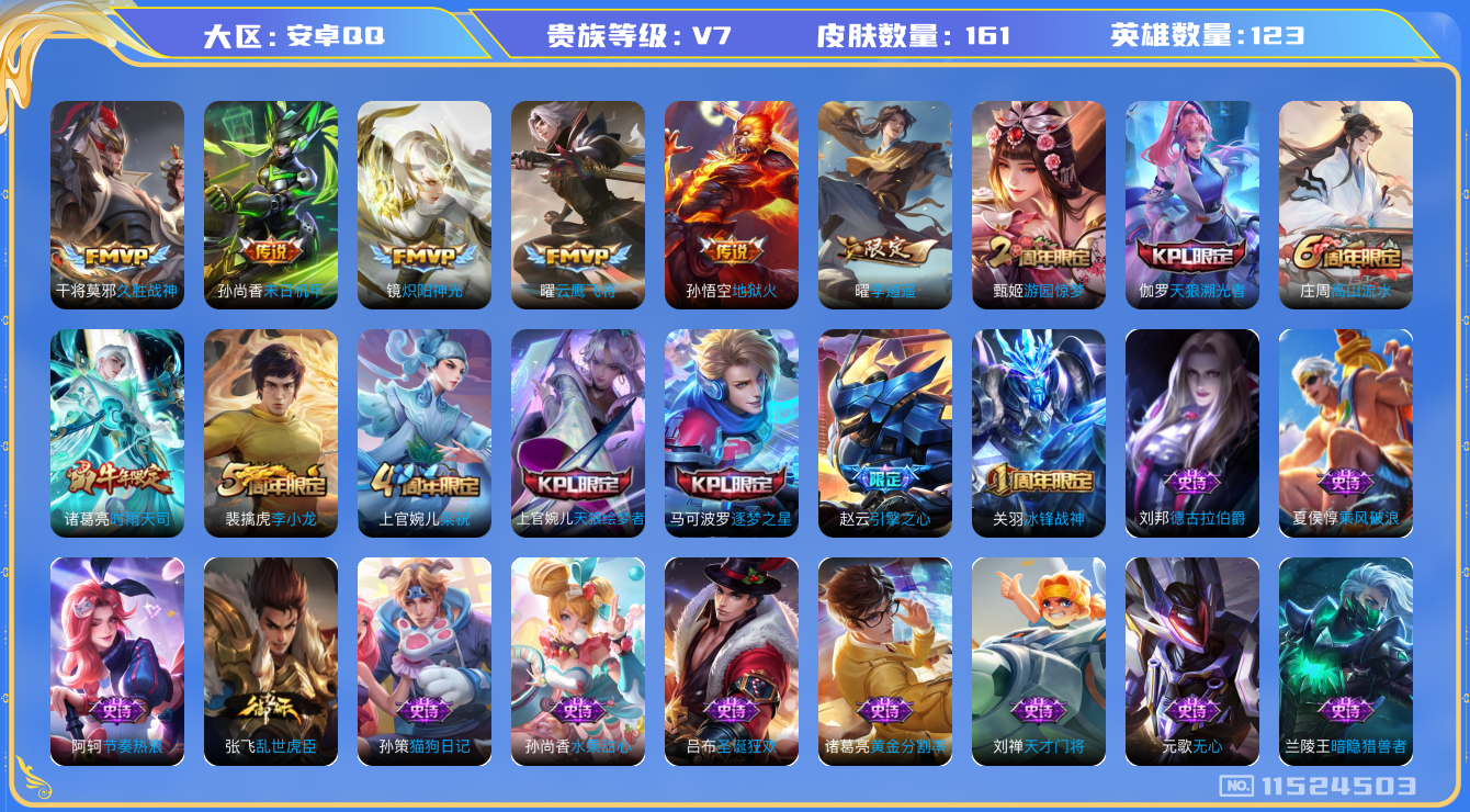 [11524503]V7 7传说 123英雄 161皮肤 可修改实名 优质装备:云鹰飞将(小将军),久胜战神,炽阳神光,末日机甲-孙尚香(绿蚂蚱),地狱火,李逍遥 珍宝阁皮:玩趣恶龙 限定皮:时雨天司(水龙头),高山流水,冰锋战神,游园惊梦,梁祝,逐梦之星,天狼溯光者,天狼绘梦者,李小龙,引擎之心 史诗皮:黄金分割率,千年之狐,偶像歌手,猫狗日记-孙策,乱世虎臣,节奏热浪,女仆咖啡,水果甜心,天才门将,星夜王子,德古拉伯爵,暗隐猎兽者,心灵战警,舞动绿茵,纤云弄巧,繁星吟游(呼啦呼啦),乘风破浪,逐浪之夏,水晶猎龙者,金属风暴,原初追逐者,圣诞狂欢,圣诞恋歌,鹰眼统帅,魅力维加斯,黎明之约,无心