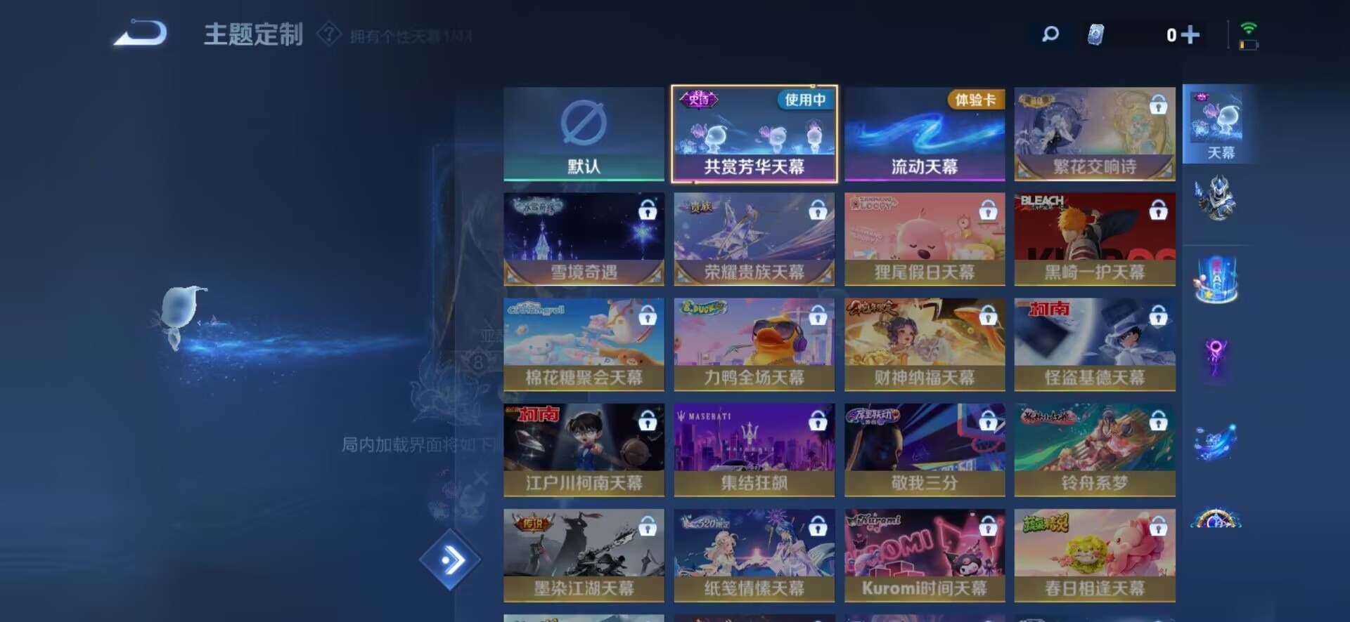 大乔猫狗日记,刘邦德古拉伯爵,夏侯惇乘风破浪,阿轲节奏热浪,沈梦溪匿光破解者,铠曙光守护者,曹操幽灵船长,廉颇地狱岩魂,伽罗箭羽风息,小乔缤纷独角兽,孙策猫狗日记,不知火舞魅语,鲁班七号电玩小子,项羽苍穹之光,吕布圣诞狂欢,露娜紫霞仙子,吕布末日机甲,诸葛亮黄金分割率,刘禅电玩·爆裂旋风,刘禅天才门将,刘禅绅士熊喵,宫本武藏鬼剑武藏,兰陵王暗隐猎兽者,貂蝉圣诞恋歌,花木兰水晶猎龙者,李白千年之狐,安琪拉心灵骇客,白起星夜王子,亚瑟心灵战警,嬴政摇滚巨星,嬴政暗夜贵公子,程咬金功夫厨神,百里玄策原初追逐者,雅典娜冰冠公主,雅典娜黎明之约,韩信白龙吟,李元芳逐浪之夏,百里守约特工魅影,墨子龙骑士,墨子金属风暴,蔡文姬舞动绿茵,澜赏金猎手,弈星滕王阁序,王昭君偶像歌手,橘右京修罗