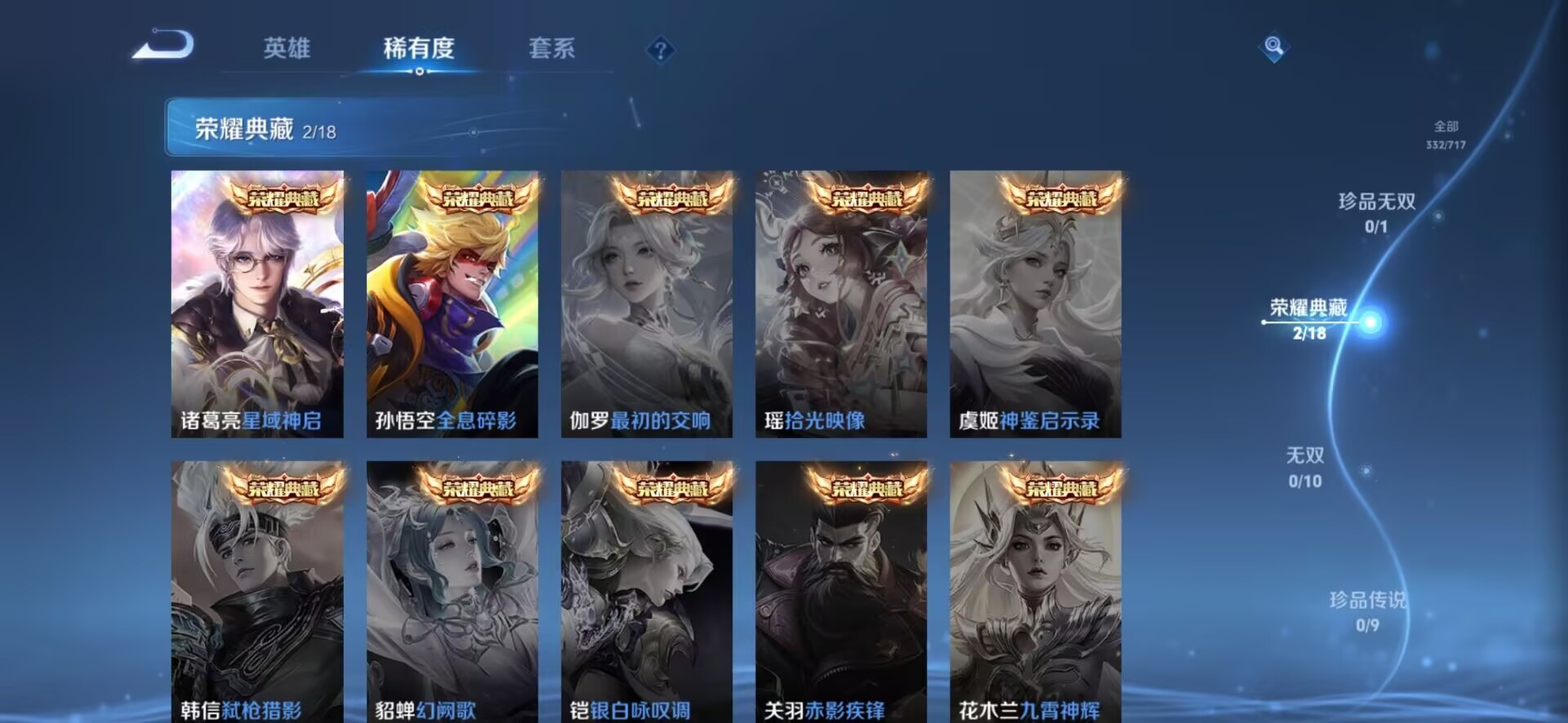 铠青龙志,曹操天狼征服者,伽罗天狼溯光者,张飞虎魄,后羿辉光之辰,公孙离玉兔公主,公孙离蜜橘之夏,裴擒虎李小龙,裴擒虎天狼狩猎者,上官婉儿梁祝,花木兰默契交锋,花木兰瑞麟志,西施至美·乘鲤谣,桑启鸣野蒿,猪八戒猪悟能,女娲补天,孙悟空大圣娶亲,孙悟空至尊宝,赵云引擎之心,韩信傲雪梅枪,关羽冰锋战神