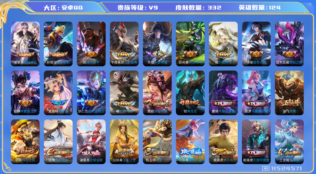 [11524571]V9 2典藏 15传说 124英雄 332皮肤 可修改实名 荣耀水晶:全息碎影(猴子典藏),星域神启(倪克斯贼亮) 传说皮:仲夏夜之梦(大飞蛾),地狱之眼,末日机甲-孙尚香(绿蚂蚱),一念神魔,久胜战神,云鹰飞将(小将军),炽阳神光,音你心动-周瑜,绛天战甲(鸡嘴战神),超时空战士-狄仁杰,浮生妄 珍宝阁皮:妄想食味,优雅恋人,女武神 限定皮:鸣野蒿,至尊宝,武陵仙君(小桃花),傲雪梅枪,补天,瑞麟志(木兰年限),至美·乘鲤谣,遇见飞天,高山流水,五谷丰年,青龙志(铠年限),冰锋战神,游园惊梦,梁祝,天狼狩猎者,天狼溯光者,虎魄,天狼征服者,李小龙,辉光之辰,默契交锋-花木兰,猪悟能,大圣娶亲,引擎之心,蜜橘之夏,玉兔公主 史诗皮:龙之律动,百相守梦-周瑜,紫霞仙子,苍穹之光,电玩小子(小书包),白龙吟,黄金分割率,特工魅影,千年之狐,电玩·爆裂旋风,匿光破解者,冰冠公主,江河有灵,蒙恬荣光圣徽,偶像歌手,魅语,龙骑士(小龙虾),末日机甲-吕布,猫狗日记-孙策,猫狗日记-大乔,乱世虎臣,节奏热浪,修罗,女仆咖啡,摇滚巨星,水果甜心,绅士熊喵,天才门将,星夜王子,心灵骇客,功夫厨神,德古拉伯爵,暗隐猎兽者,幽灵船长,鬼剑武藏,心灵战警,舞动绿茵,地狱岩魂,纤云弄巧,繁星吟游(呼啦呼啦),缤纷独角兽,乘风破浪,逐浪之夏,月团寄思,水晶猎龙者,曙光守护者,箭羽风息,金属风暴,原初追逐者,圣诞狂欢,圣诞恋歌,鹰眼统帅,王者之锤,暗夜贵公子,魅力维加斯,黎明之约,赏金猎手,滕王阁序,无心,未来纪元-赵云