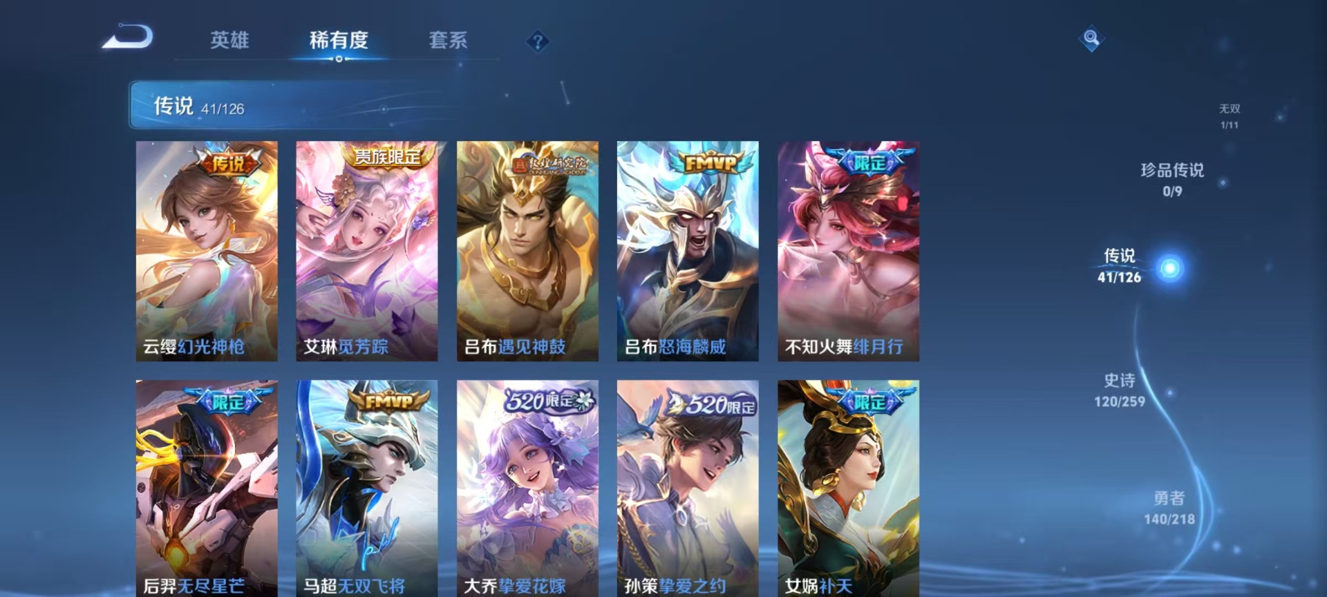 大乔挚爱花嫁,铠绛天战甲,刘备时之恋人,赵云淬星耀世,干将莫邪久胜战神,小乔音你心动,李信一念神魔,孙策挚爱之约,王昭君乞巧织情,吕布遇见神鼓,镜炽阳神光,周瑜音你心动,貂蝉遇见胡旋,貂蝉猫影幻舞,艾琳觅芳踪,西施游龙清影,孙悟空零号·赤焰,曜云鹰飞将,曜李逍遥,马超无双飞将,云缨幻光神枪