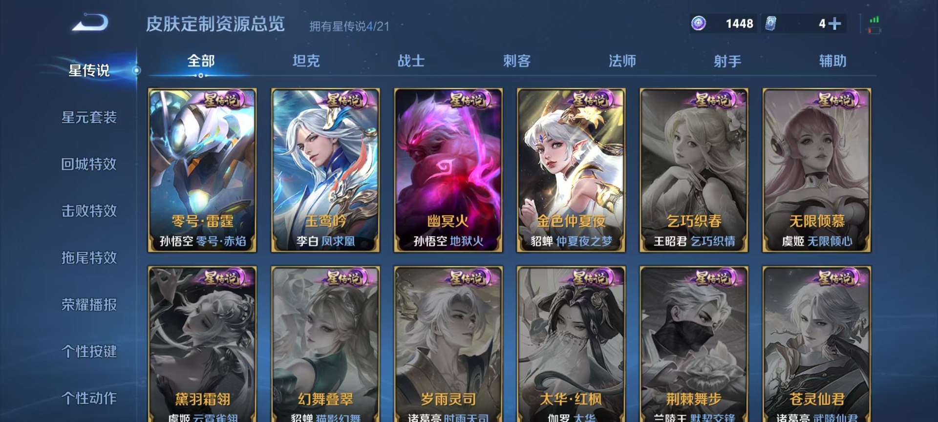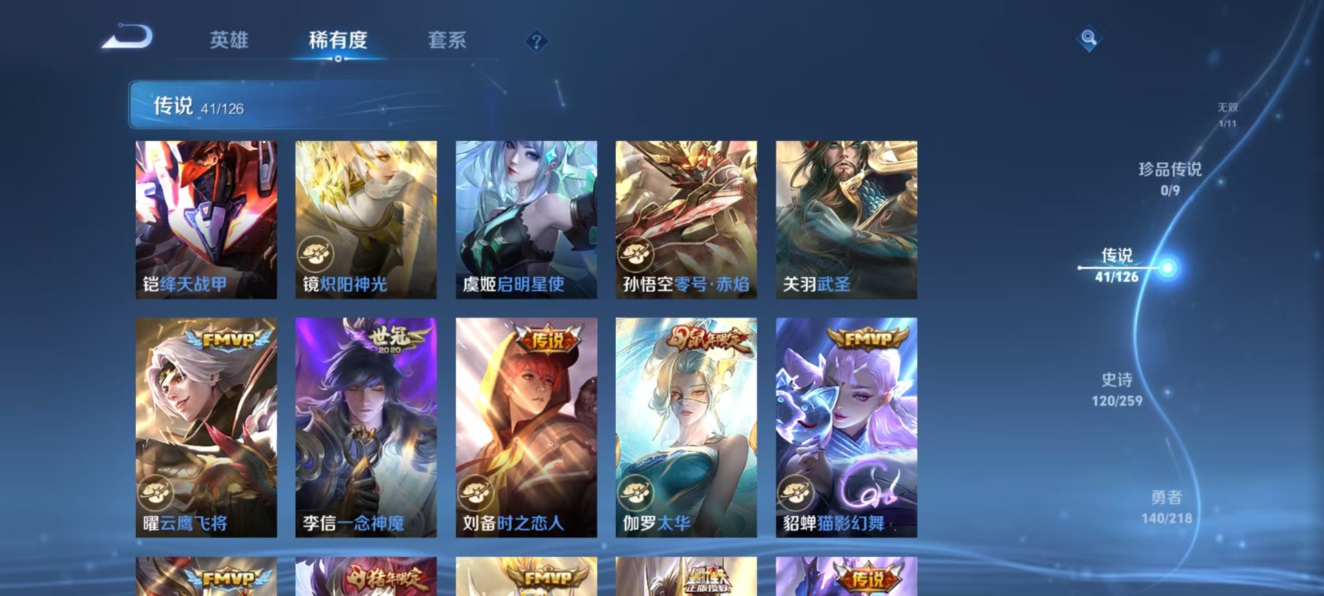 金蝉唐三藏,夏侯惇匿光决锋者,哪吒逐梦之翼,甄姬女儿国国王,铠青龙志,伽罗太华,苏烈玄武志,张飞虎魄,赵云百木心枪,赵云龙胆,典韦岱宗,孙尚香异界灵契,不知火舞绯月行,鲁班七号寅虎·瑞焰,后羿无尽星芒,吕布御风骁将,后羿如梦令,镜匿光追影者,公孙离玉兔公主,公孙离蜜橘之夏,裴擒虎梅西,上官婉儿梁祝,上官婉儿天狼绘梦者,花木兰青春决赛季,猪八戒猪悟能,女娲补天,孙悟空孙行者,孙悟空至尊宝,孙悟空美猴王,百里玄策白虎志,马超神威,妲己时之彼端,妲己时之奇旅,韩信傲雪梅枪,韩信飞衡,韩信逐梦之影,百里守约朱雀志,瑶时之祈愿,妲己热情桑巴,关羽武圣,关羽冰锋战神