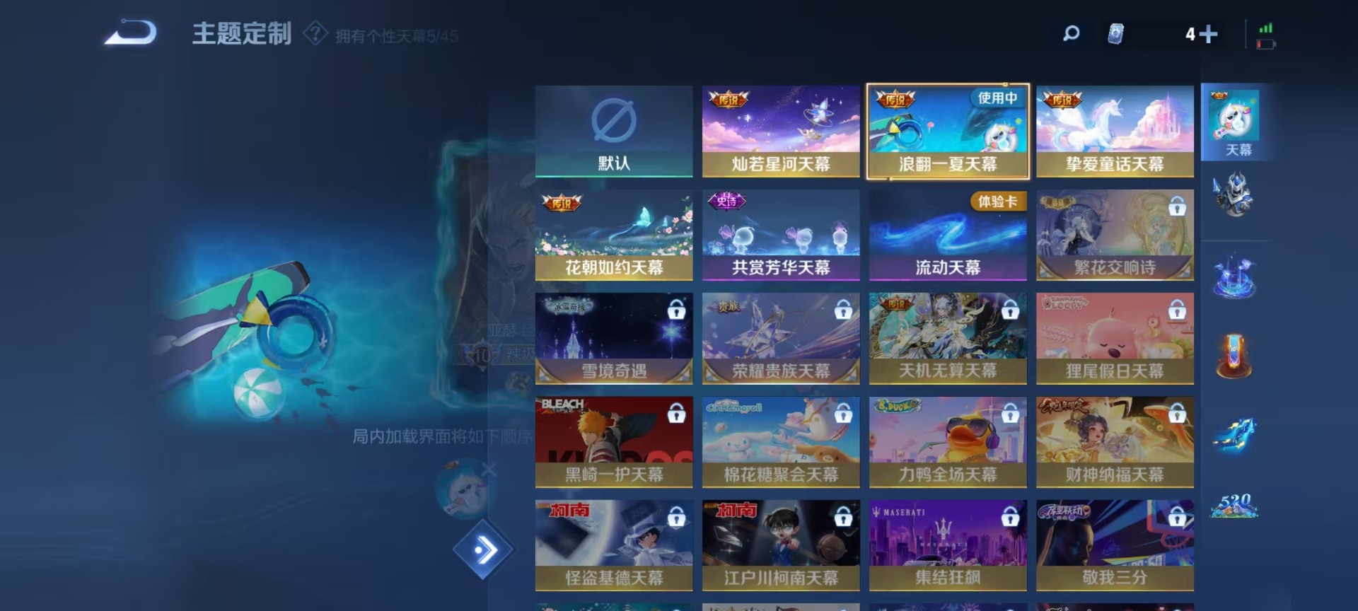 大乔猫狗日记,刘邦德古拉伯爵,夏侯惇乘风破浪,阿轲暗夜猫娘,阿轲节奏热浪,铠曙光守护者,曹操幽灵船长,伽罗箭羽风息,廉颇地狱岩魂,小乔缤纷独角兽,小乔青蛇,孙尚香时之恋人,孙策猫狗日记,不知火舞魅语,鲁班七号电玩小子,项羽苍穹之光,吕布圣诞狂欢,露娜紫霞仙子,吕布末日机甲,诸葛亮黄金分割率,刘禅电玩·爆裂旋风,司马懿暗渊魔法,刘禅天才门将,刘禅绅士熊喵,宫本武藏鬼剑武藏,公孙离无限星赏官,兰陵王暗隐猎兽者,貂蝉圣诞恋歌,貂蝉唤灵魅影,花木兰水晶猎龙者,夏洛特永昼,李白千年之狐,安琪拉心灵骇客,安琪拉时之奇旅,杨戬天秀·启明,白起星夜王子,亚瑟心灵战警,张良千筹问战,嬴政摇滚巨星,嬴政暗夜贵公子,程咬金功夫厨神,百里玄策原初追逐者,雅典娜冰冠公主,雅典娜黎明之约,韩信白龙吟,李元芳逐浪之夏,百里守约特工魅影,墨子龙骑士,墨子金属风暴,蔡文姬舞动绿茵,瑶遇见神鹿,澜赏金猎手,娜可露露晚萤,王昭君偶像歌手,嫦娥拒霜思,橘右京修罗
