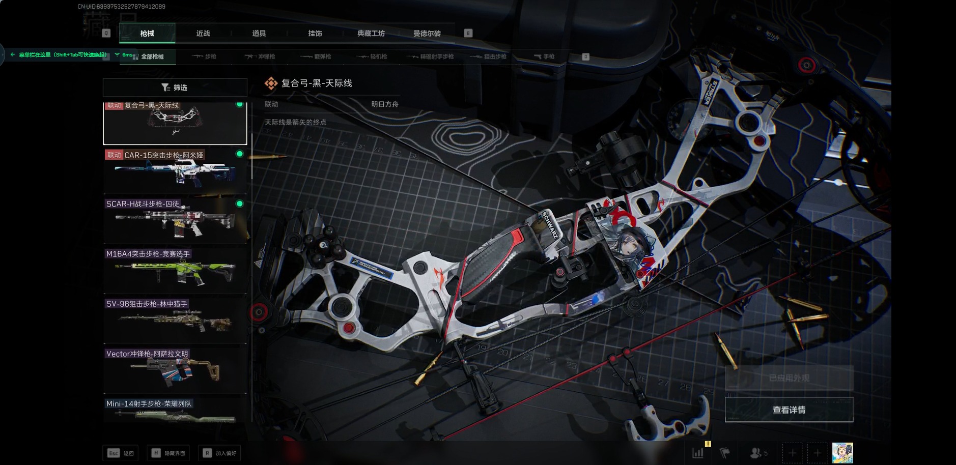 [11524636]总资产:117.5 7传说枪械 进阶安全箱(9.17到期) 可二次 可修改实名 烽火地带段位:钻石 全面战场段位:列兵 哈夫币:15.964 传说武器皮肤:M16A4突击步枪-狩猎时刻,G3战斗步枪-狩猎时刻,Vector冲锋枪-狩猎时刻,复合弓-黑-天际线,CAR-15突击步枪-阿米娅,M4A1突击步枪-阿米娅,勇士冲锋枪-能天使-午夜邮差 史诗武器皮肤:M16A4突击步枪-竞赛选手,SV-98狙击步枪-林中猎手,SCAR-H战斗步枪-囚徒,Vector冲锋枪-阿萨拉文明
