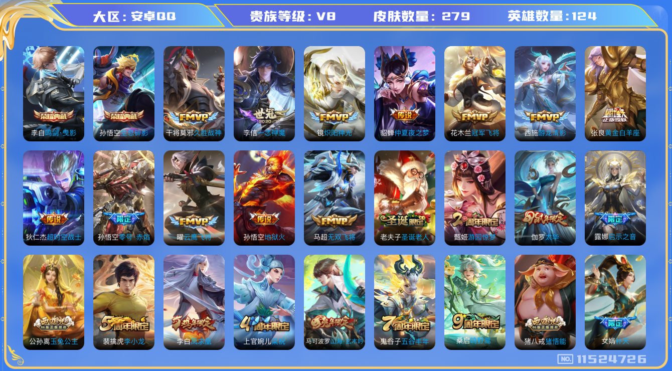 [11524726]V8 2典藏 18传说 124英雄 279皮肤 可修改实名 女号 优质装备:鸣剑·曳影,全息碎影(猴子典藏),冠军飞将,云鹰飞将(小将军),黄金白羊座,久胜战神,炽阳神光,一念神魔,地狱火,仲夏夜之梦(大飞蛾),零号·赤焰,游龙清影(小青龙),超时空战士-狄仁杰,无双飞将 珍宝阁皮:妄想食味,蔷薇恋人,玩趣恶龙 限定皮:鸣野蒿,至尊宝,凤求凰(白切鸡),太华(伽罗年限),补天,五谷丰年,游园惊梦,梁祝,李小龙,圣诞老人,猪悟能,玉兔公主,启示之音,山海·玄木吟(马可年限) 史诗皮:星界战将,蒙犽顽岩魄,遇见神鹿,紫霞仙子,苍穹之光,电玩小子(小书包),黄金分割率,特工魅影,永昼,电玩·爆裂旋风,江河有灵,蒙恬荣光圣徽,偶像歌手,魅语,晚萤,末日机甲-吕布,猫狗日记-孙策,猫狗日记-大乔,时之恋人-孙尚香,乱世虎臣,节奏热浪,修罗,女仆咖啡,摇滚巨星,水果甜心,天才门将,星夜王子,心灵骇客,功夫厨神,德古拉伯爵,暗隐猎兽者,幽灵船长,鬼剑武藏,暗渊魔法,心灵战警,乐园奇幻夜,地狱岩魂,纤云弄巧,繁星吟游(呼啦呼啦),缤纷独角兽,乘风破浪,逐浪之夏,水晶猎龙者,曙光守护者,箭羽风息,金属风暴,原初追逐者,圣诞狂欢,鹰眼统帅,暗夜贵公子,魅力维加斯,黎明之约,赏金猎手,奇遇舞章,无心