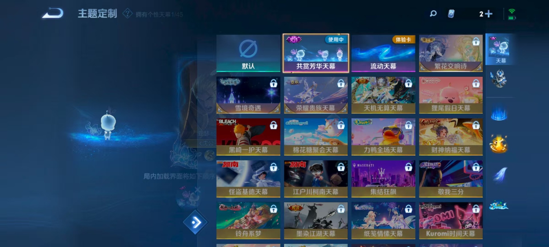 刘邦德古拉伯爵,阿轲节奏热浪,铠曙光守护者,曹操幽灵船长,小乔缤纷独角兽,海月浮梦罗烟,吕布圣诞狂欢,吕布末日机甲,露娜紫霞仙子,诸葛亮黄金分割率,刘禅电玩·爆裂旋风,刘禅天才门将,宫本武藏鬼剑武藏,兰陵王暗隐猎兽者,貂蝉唤灵魅影,李白谪仙醉月,花木兰水晶猎龙者,李白千年之狐,夏洛特永昼,白起星夜王子,白起苍鳞隐世,嬴政暗夜贵公子,百里玄策原初追逐者,雅典娜黎明之约,墨子金属风暴,蔡文姬舞动绿茵,王昭君偶像歌手,嫦娥拒霜思,橘右京修罗