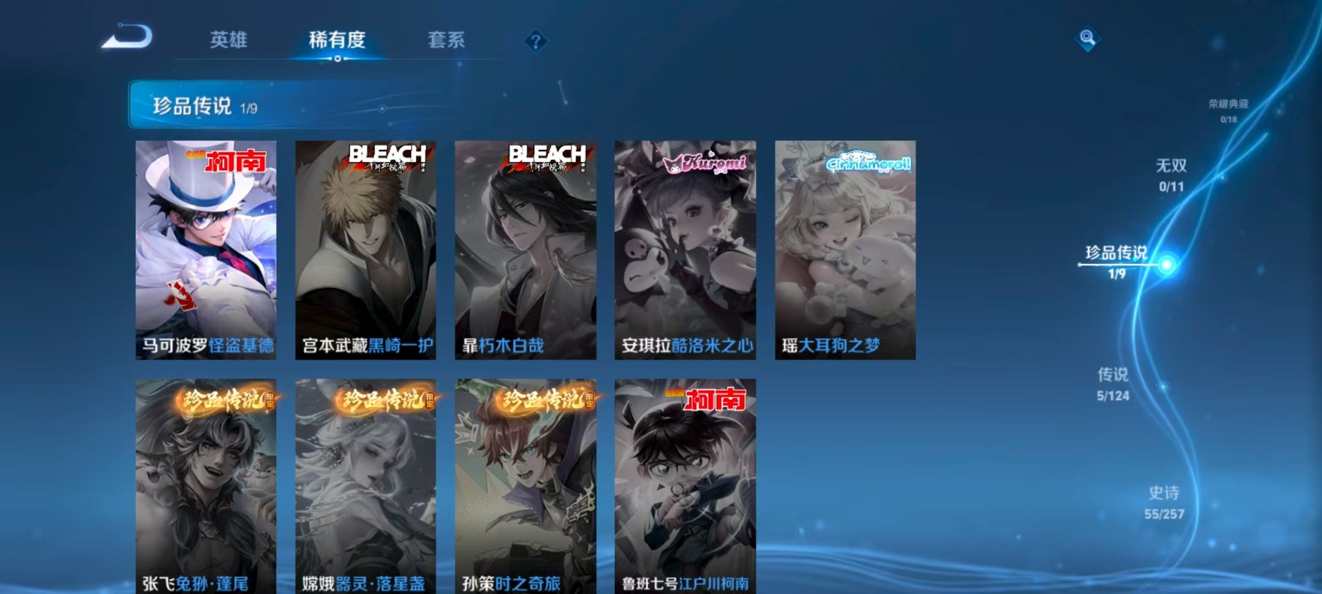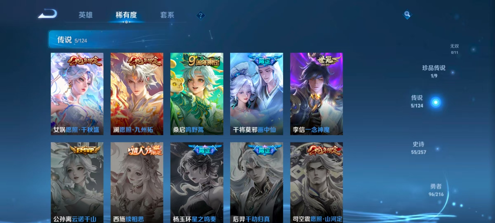 - PX_2079608-48 安卓QQ/至尊星耀/162皮肤/124英雄/2典藏/0珍品无双/0无双/2珍品传说/16传说/39史诗/8稀有英雄 【2 珍品传说】怪盗基德 马可波罗,时之奇旅 孙策, 【2 典藏皮肤】银白咏叹调 铠,弑枪猎影 韩信, 【16 传说皮肤】武圣 关羽,电玩·雷克斯 澜,无双飞将 马超,齐天大圣 孙悟空,地狱之眼 宫本武藏,炽阳神光 镜,遇见神鼓 吕布,霜月吟 露娜,时之恋