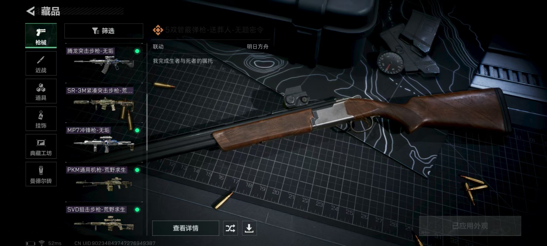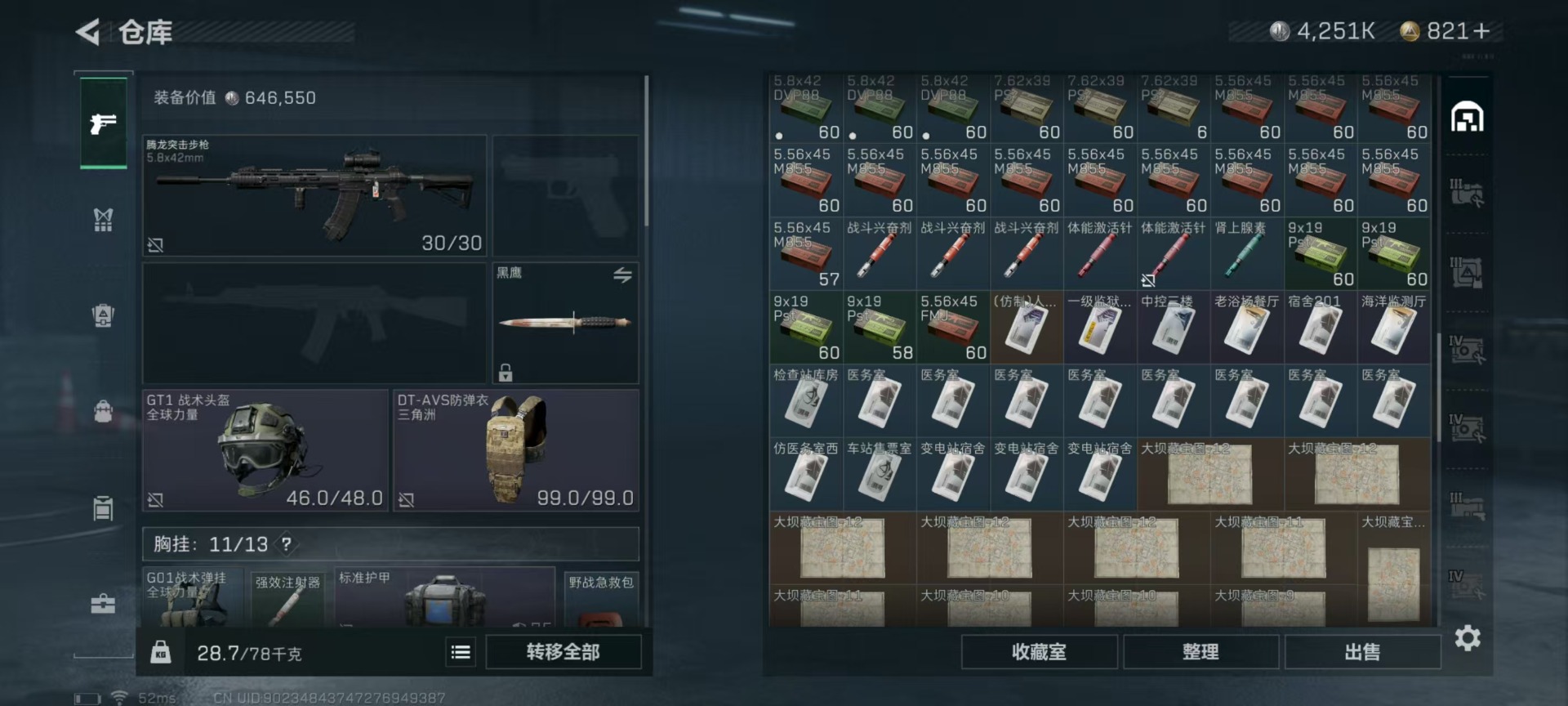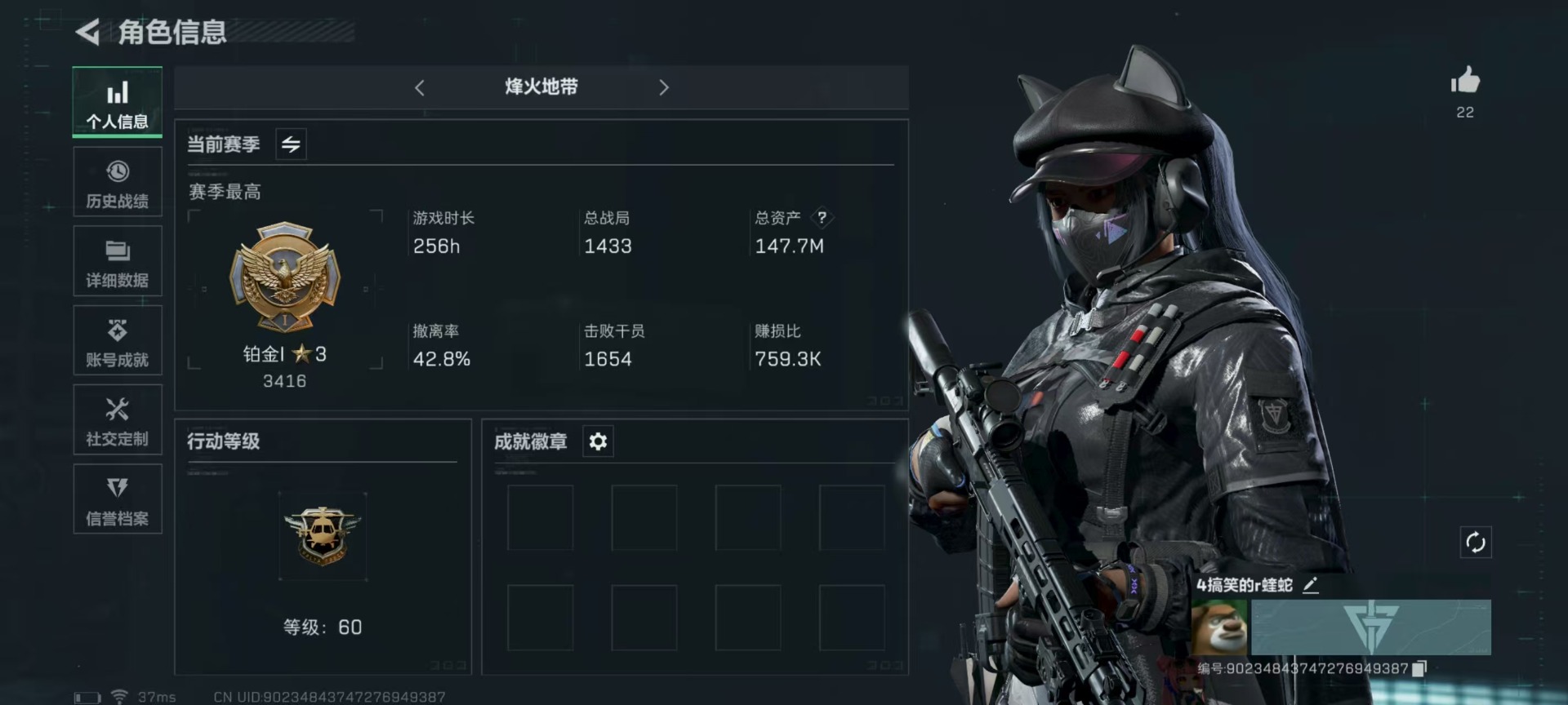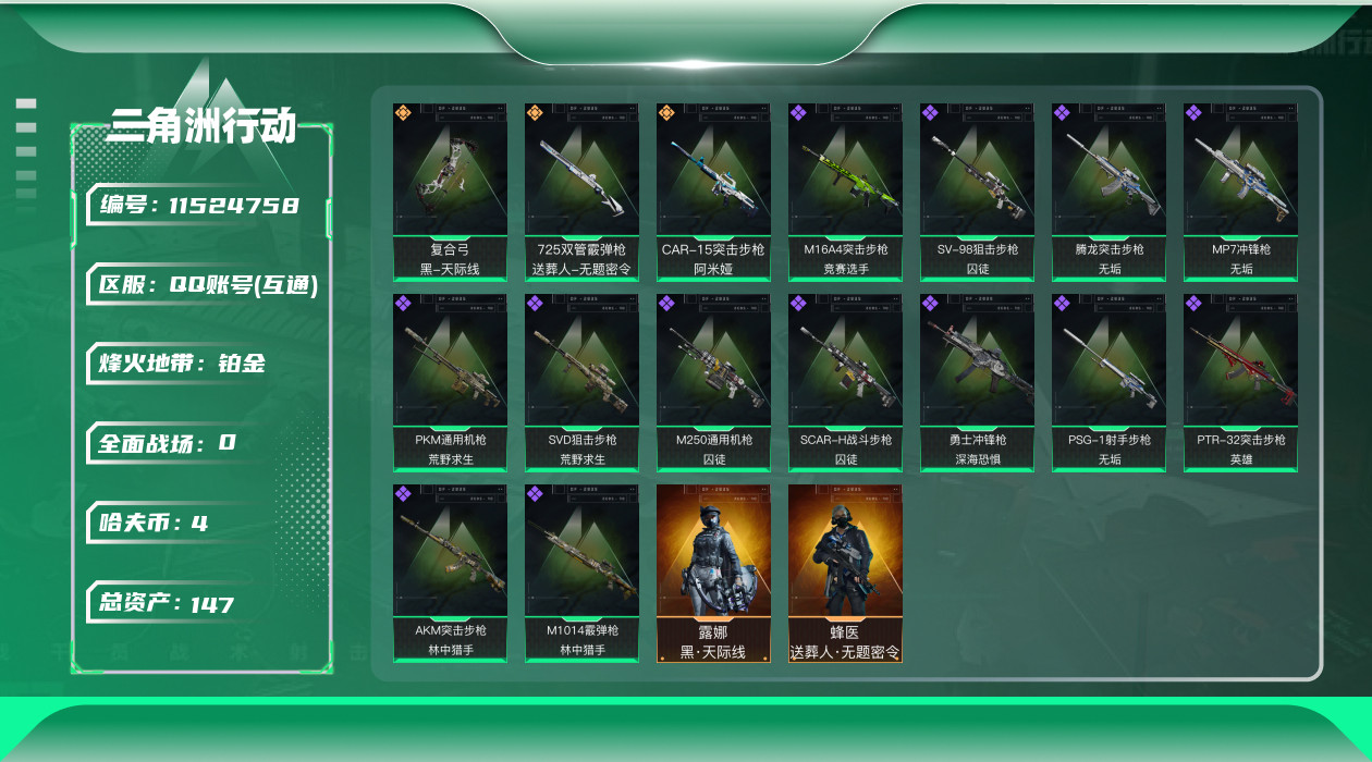 [11524758]总资产:147.7 2干员外观 3传说枪械 高级安全箱(9.17到期) 可二次 可修改实名 烽火地带段位:铂金 全面战场段位:无段位 哈夫币:4.251 传说武器皮肤:复合弓-黑-天际线,CAR-15突击步枪-阿米娅,725双管霰弹枪-送葬人-无题密令 史诗武器皮肤:PKM通用机枪-荒野求生,勇士冲锋枪-深海恐惧,AKM突击步枪-林中猎手,M16A4突击步枪-竞赛选手,SVD狙击步枪-荒野求生,M1014霰弹枪-林中猎手,PTR-32突击步枪-英雄,PSG-1射手步枪-无垢,M250通用机枪-囚徒,SV-98狙击步枪-囚徒,SCAR-H战斗步枪-囚徒,腾龙突击步枪-无垢,MP7冲锋枪-无垢 干员外观:蜂医-送葬人·无题密令(S5),露娜-黑·天际线