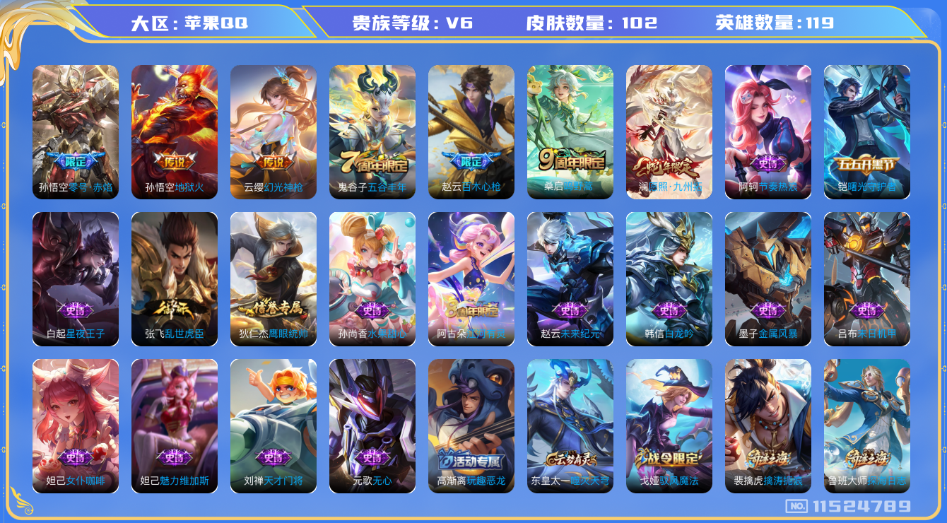- [11461680]V8 1典藏 1珍品传说 16传说 125英雄 299皮肤 可修改实名 优质装备:赤影疾锋,怪盗基德,久胜战神,一念神魔,末日机甲-孙尚香(绿蚂蚱),仲夏夜之梦(大飞蛾),时之恋人-刘备(电焊工),淬星耀世,末日机甲-孙策,无双飞将,山海·炽霜斩(李信年限),画中仙 传说皮:续相思,幻光神枪 珍宝阁皮:蔷薇恋人,女武神 限定皮:愿照·山河定(司空震年限),逐霄战戟,鸣野蒿,白虎志(电光耗子),五谷丰年,游园惊梦,李小龙,逐梦之影,猪悟能,一生所爱,大圣娶亲,神器·万象笔,山海·玄木吟(马可年限) 史诗皮:鸭鸭历险记-刘禅,绮世丹青,化蝶舞,星界战将,谪仙醉月,龙之律动,石田雨龙,茶境仙,怒海争锋,破空之剑,战舞者,蒙犽顽岩魄,蔬乡物语(鲁班七号),百相守梦-百里守约,星界特工,紫霞仙子,苍穹之光,电玩小子(小书包),白龙吟,黄金分割率,特工魅影,千年之狐,江河有灵,魅语,百解令(蒙犽),高渐离燃音魔法,蒙恬荣光圣徽,无限星赏官,冰冠公主,偶像歌手,龙骑士(小龙虾),末日机甲-吕布,猫狗日记-孙策,乱世虎臣,节奏热浪,修罗,女仆咖啡,摇滚巨星,水果甜心,天才门将,星夜王子,心灵骇客,功夫厨神,德古拉伯爵,暗隐猎兽者,幽灵船长,鬼剑武藏,心灵战警,天秀·启明,舞动绿茵,地狱岩魂,纤云弄巧,缤纷独角兽,乘风破浪,逐浪之夏,月团寄思,水晶猎龙者,曙光守护者,箭羽风息,唤灵魅影,金属风暴,原初追逐者,圣诞狂欢,圣诞恋歌,鹰眼统帅,魅力维加斯,无心,未来纪元-赵云